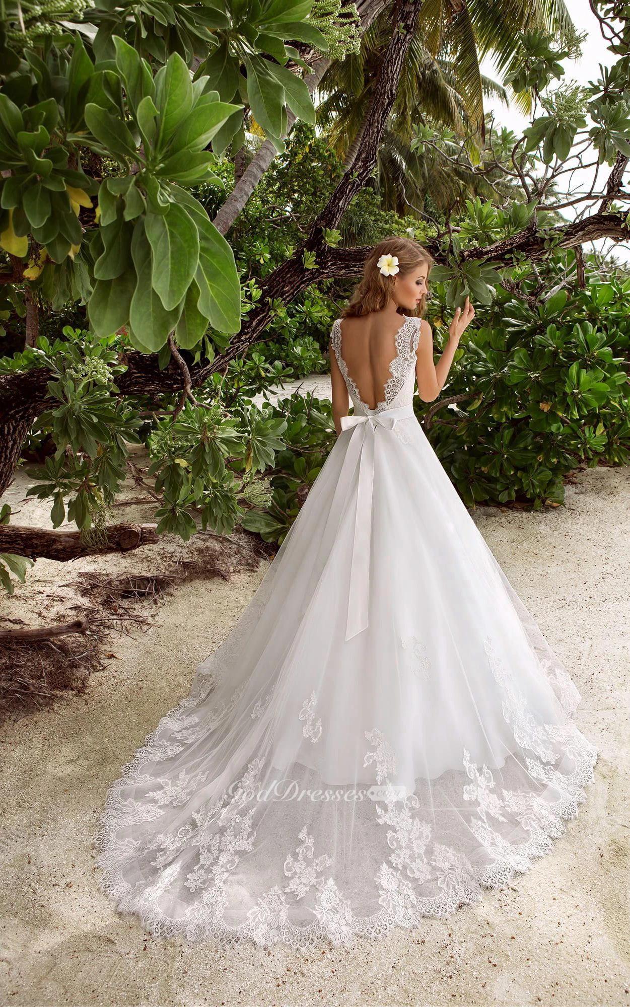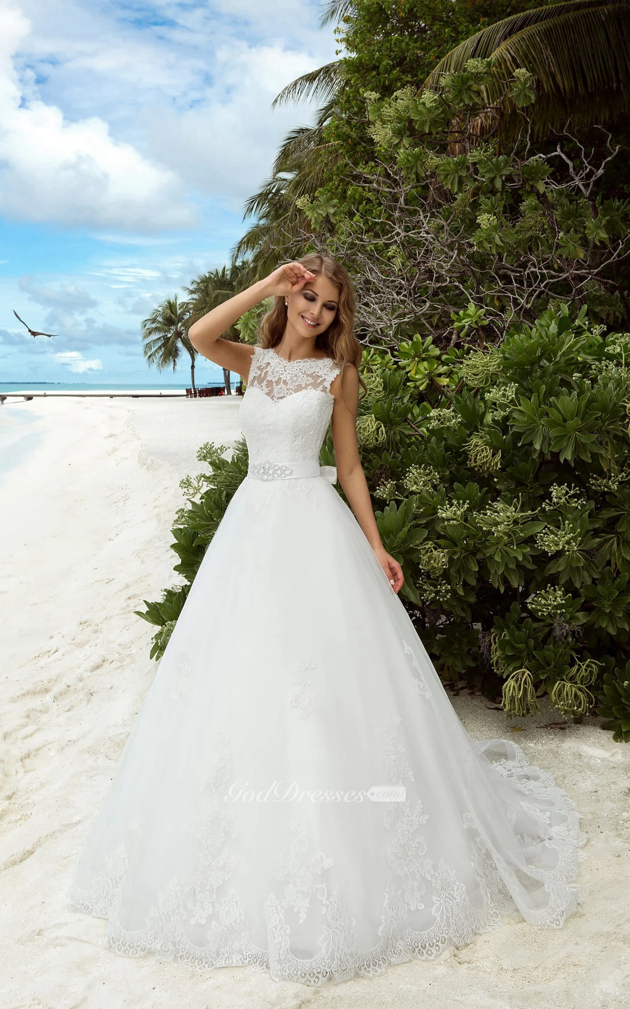 A-Line Floor-Length Jewel-Neck Sleeveless Deep-V-Back Organza Dress With Sash And Appliques