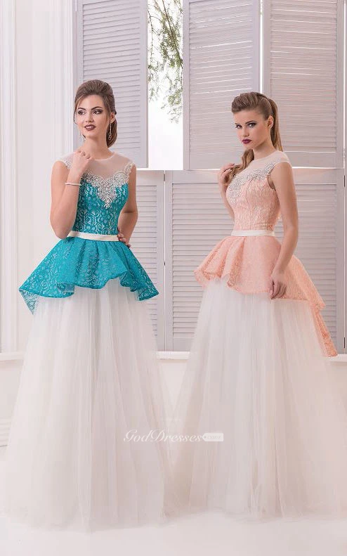 A-Line Floor-Length Jewel Short Sleeve Tulle Beading Lace Zipper Dress