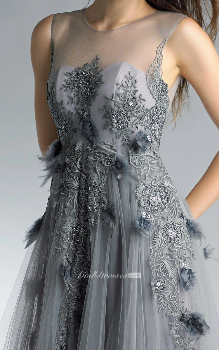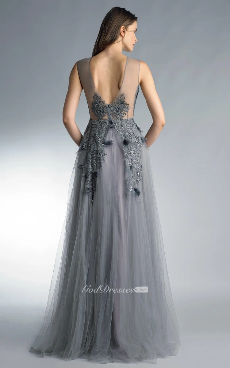 A-line Floor-length Jewel Short Sleeve Tulle Low-V Back Dress