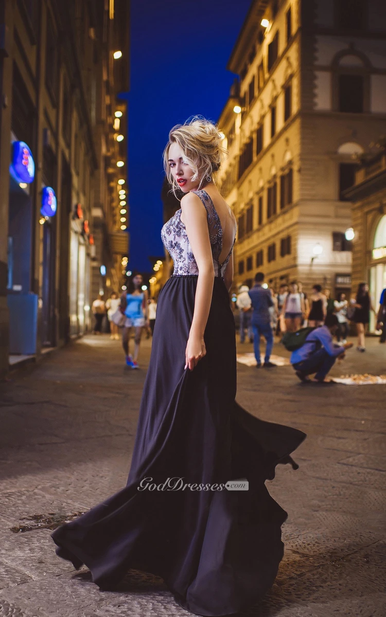A-Line Floor-Length Jewel Sleeveless Chiffon Beading Appliques Low-V Back Dress