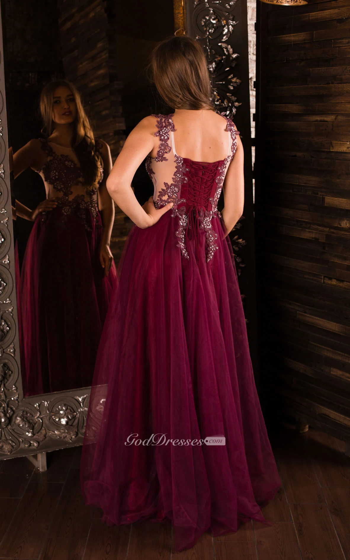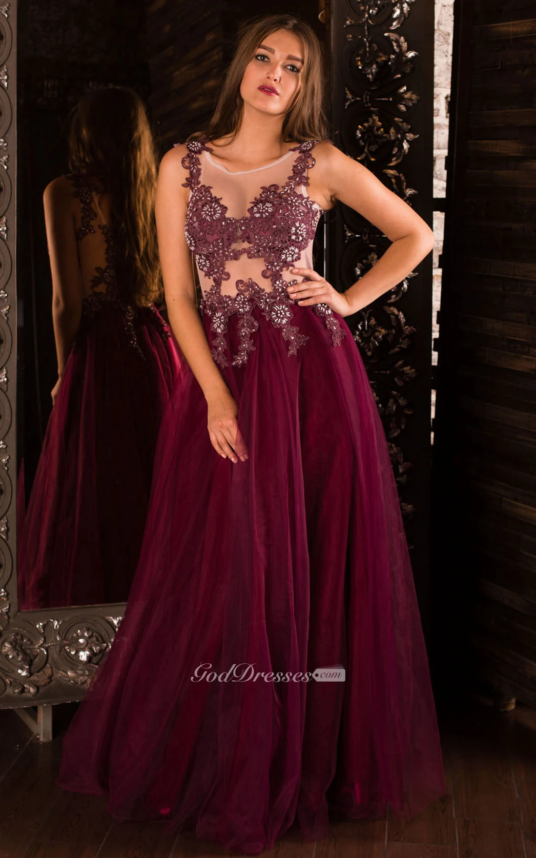 A-Line Floor-Length Jewel Sleeveless Tulle Beading Appliques Lace-Up Dress