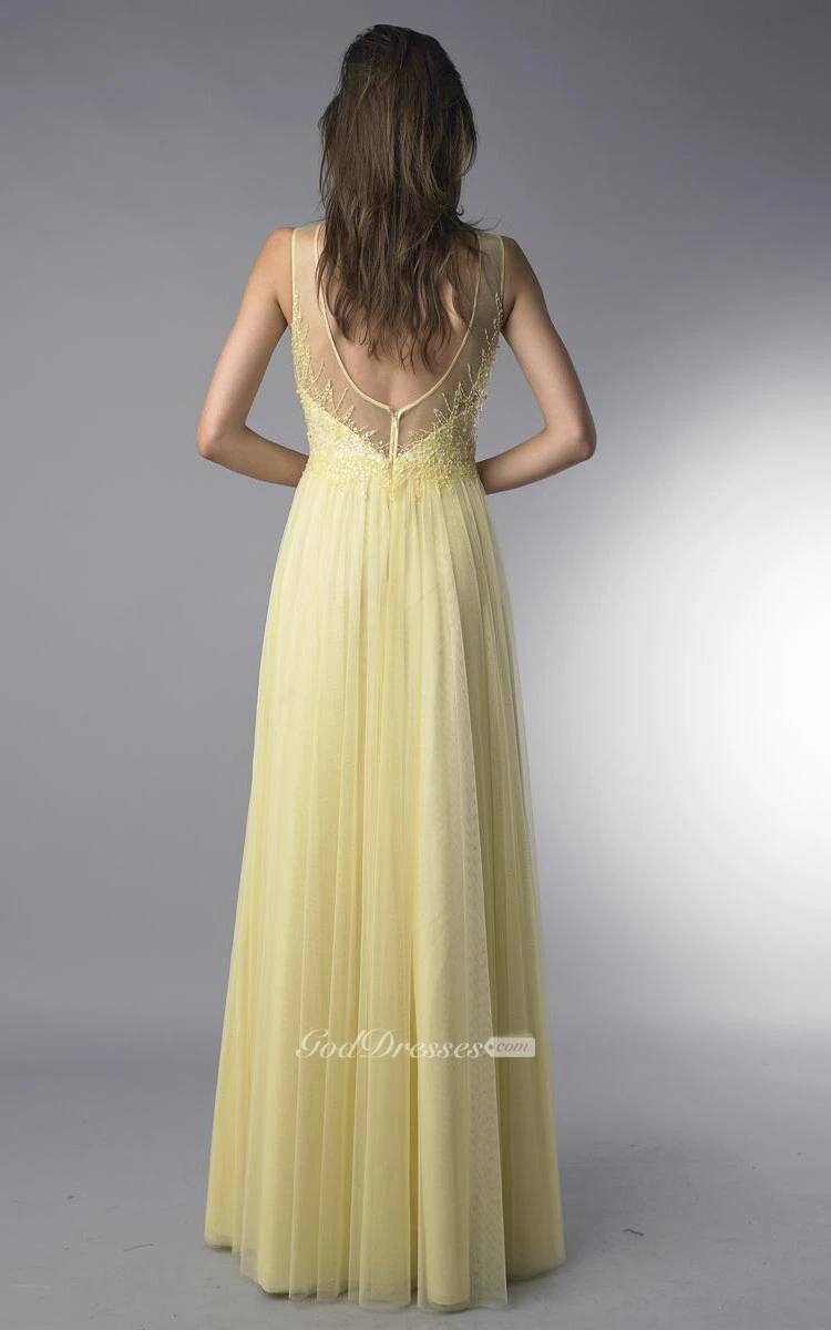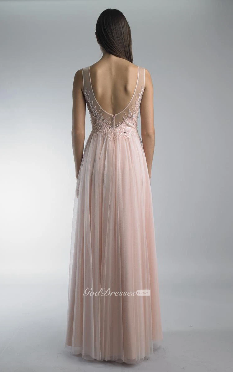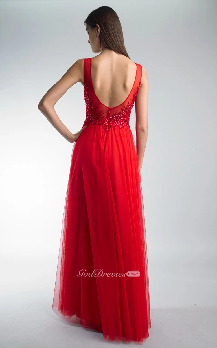A-line Floor-length Jewel Sleeveless Tulle Low-V Back Dress