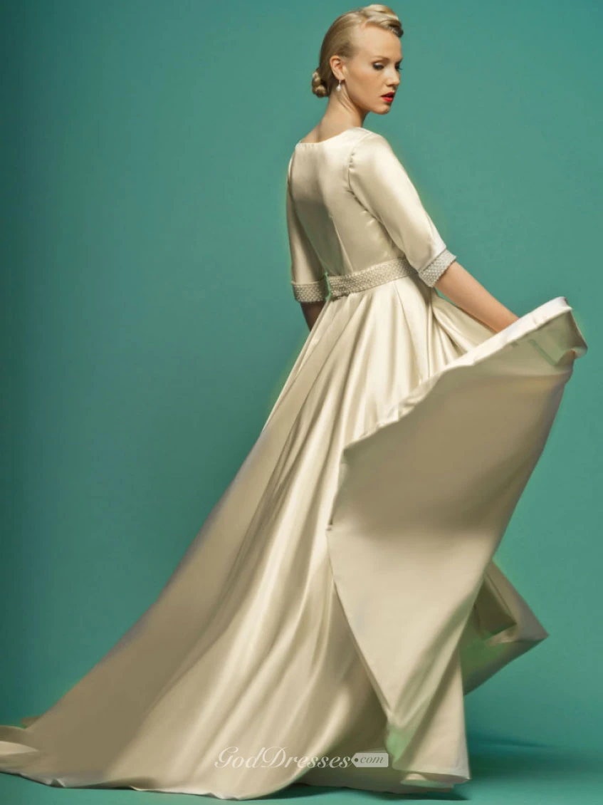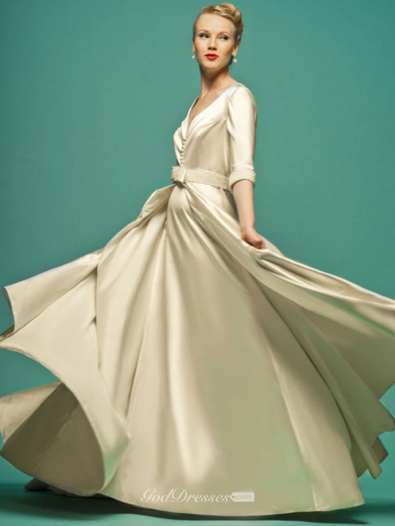 A-Line Floor-Length Jeweled V-Neck Half-Sleeve Satin Wedding Dress With Cape