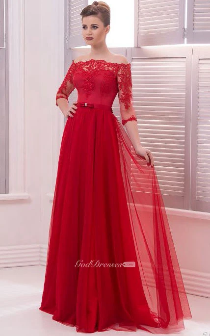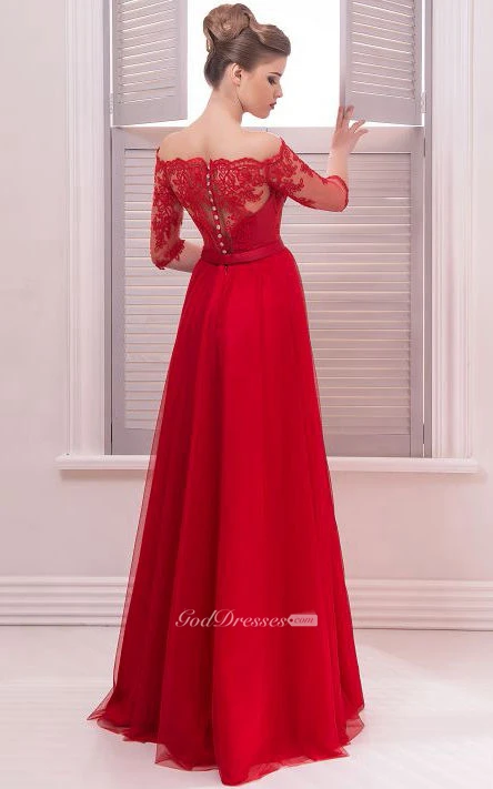 A-Line Floor-Length Off-The-Shoulder 3 Tulle Lace Pleats Button Dress