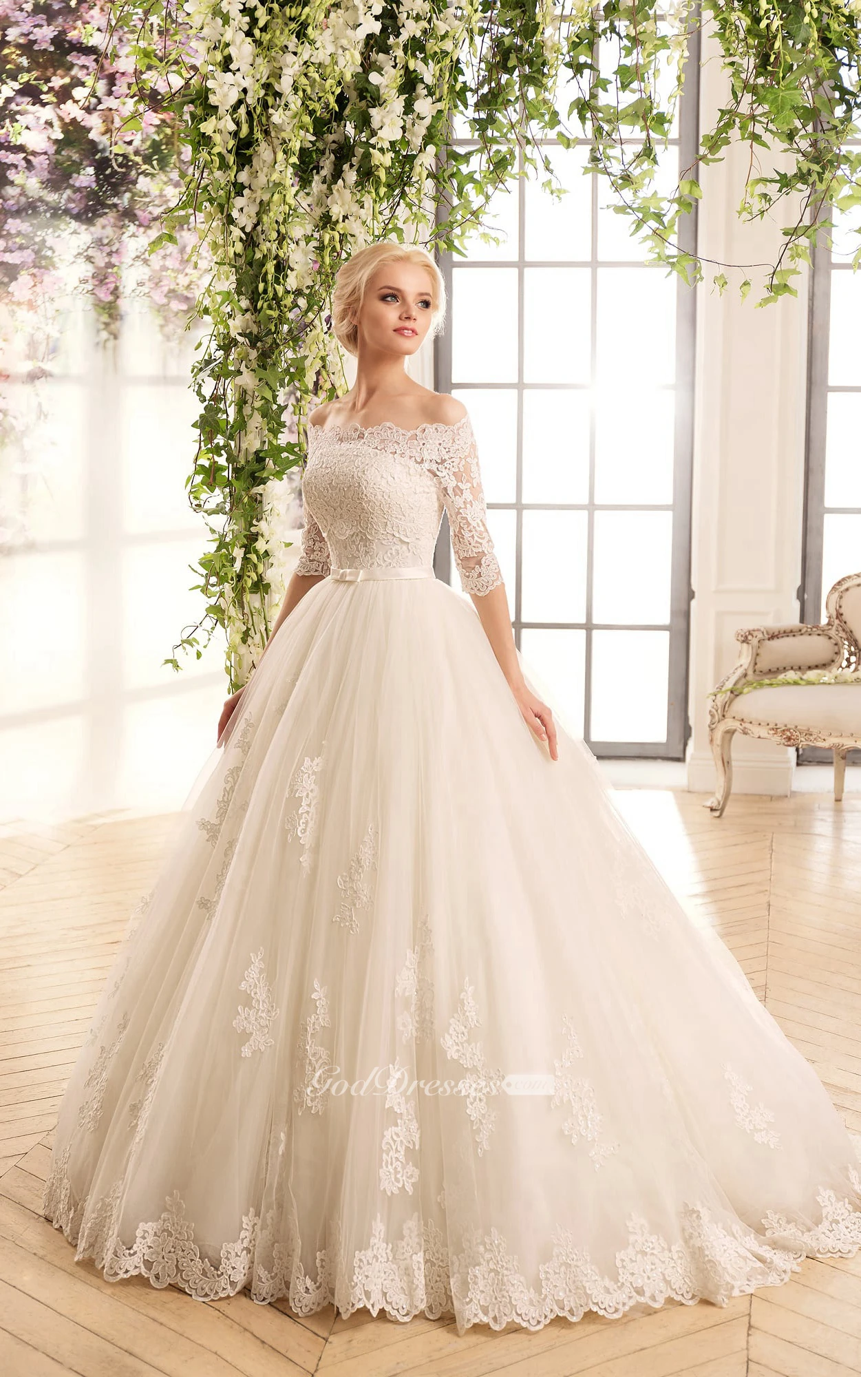 A-Line Floor-Length Off-The-Shoulder Half-Sleeve Illusion Lace Tulle Dress With Appliques