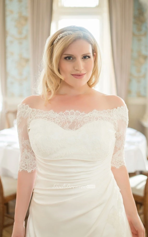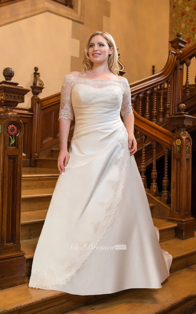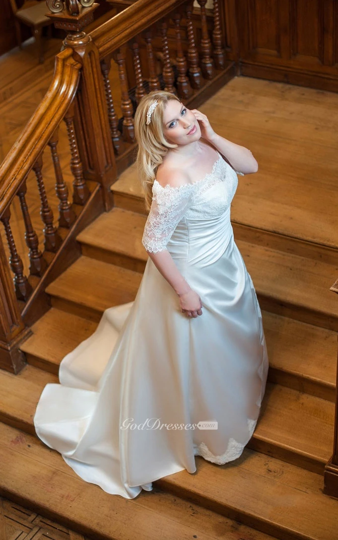 A-Line Floor-Length Off-The-Shoulder Half Sleeve Satin Sweep Train Lace Dress