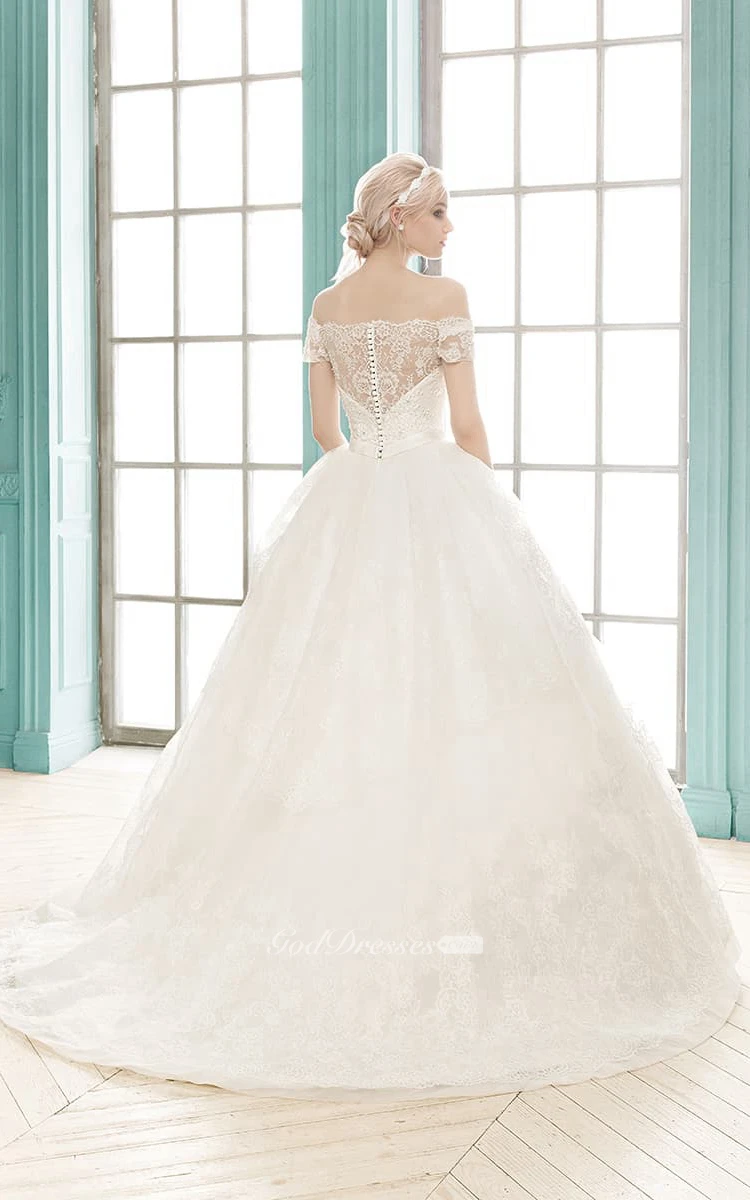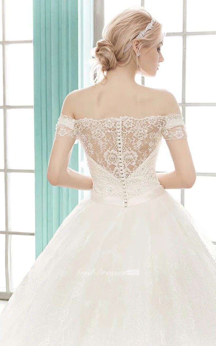 A-line Floor-length Off-the-shoulder Illusion Back Lace Dress With Flower