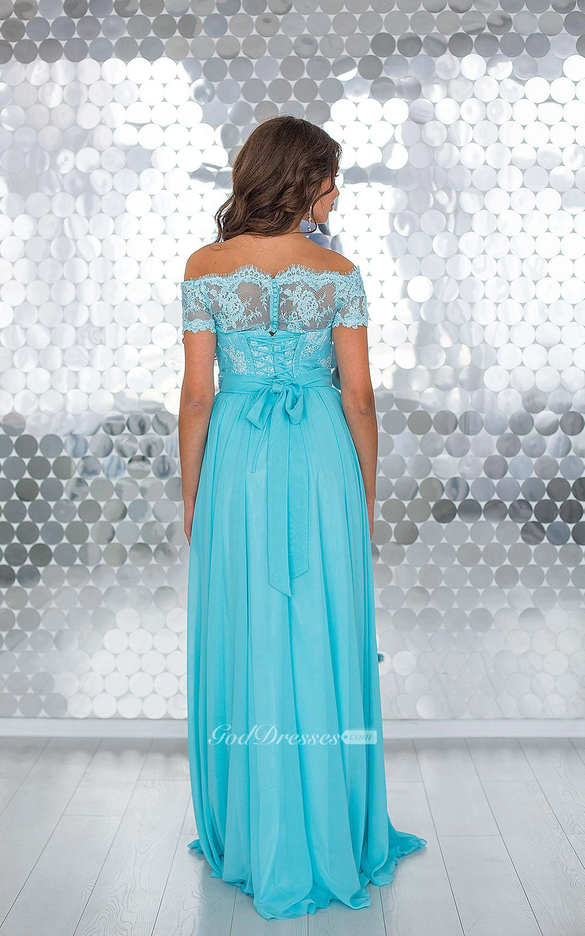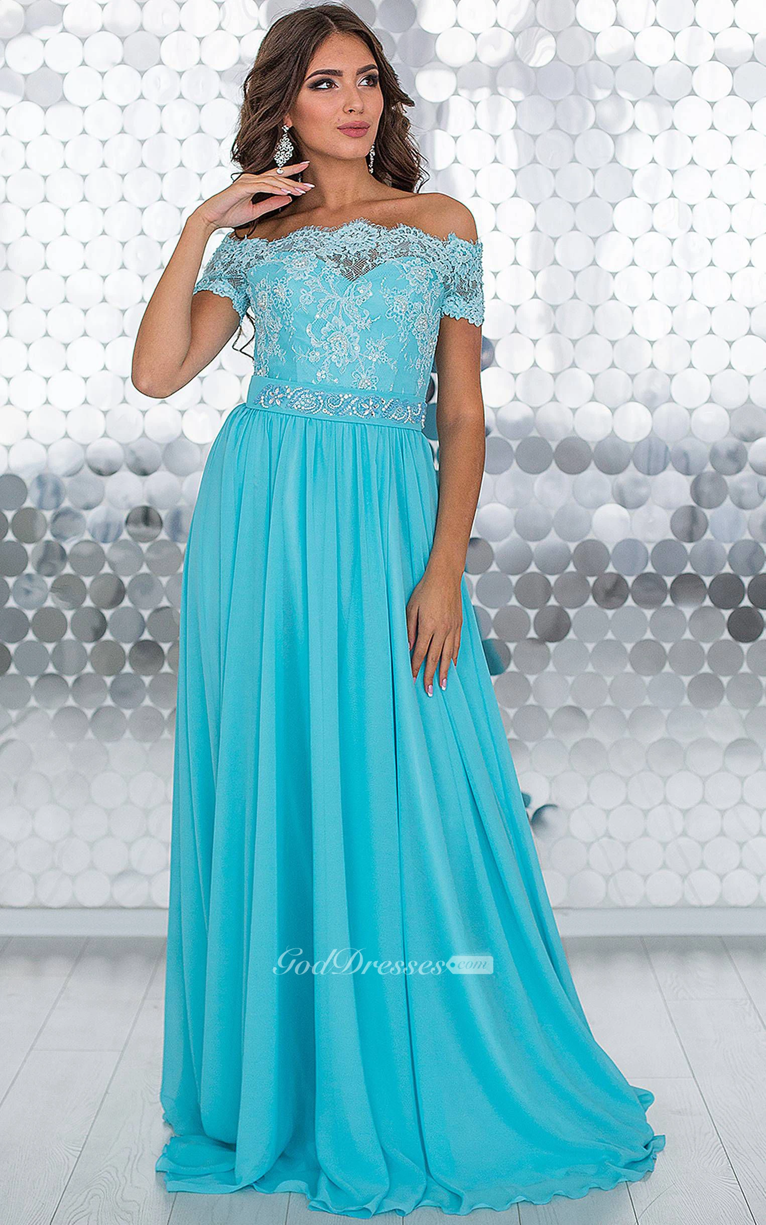 A-Line Floor-Length Off-The-Shoulder Short Sleeve Chiffon Lace Pleats Lace-Up Dress