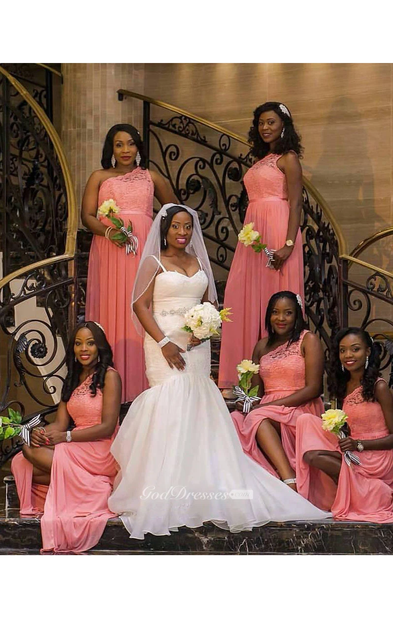 A-line Floor-length One-shoulder Sleeveless Appliques Chiffon Lace Dress