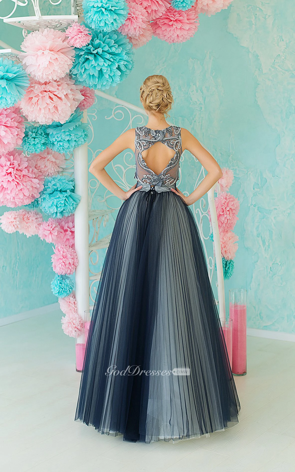 A-Line Floor-Length Queen Anne Sleeveless Tulle Appliques Keyhole Dress