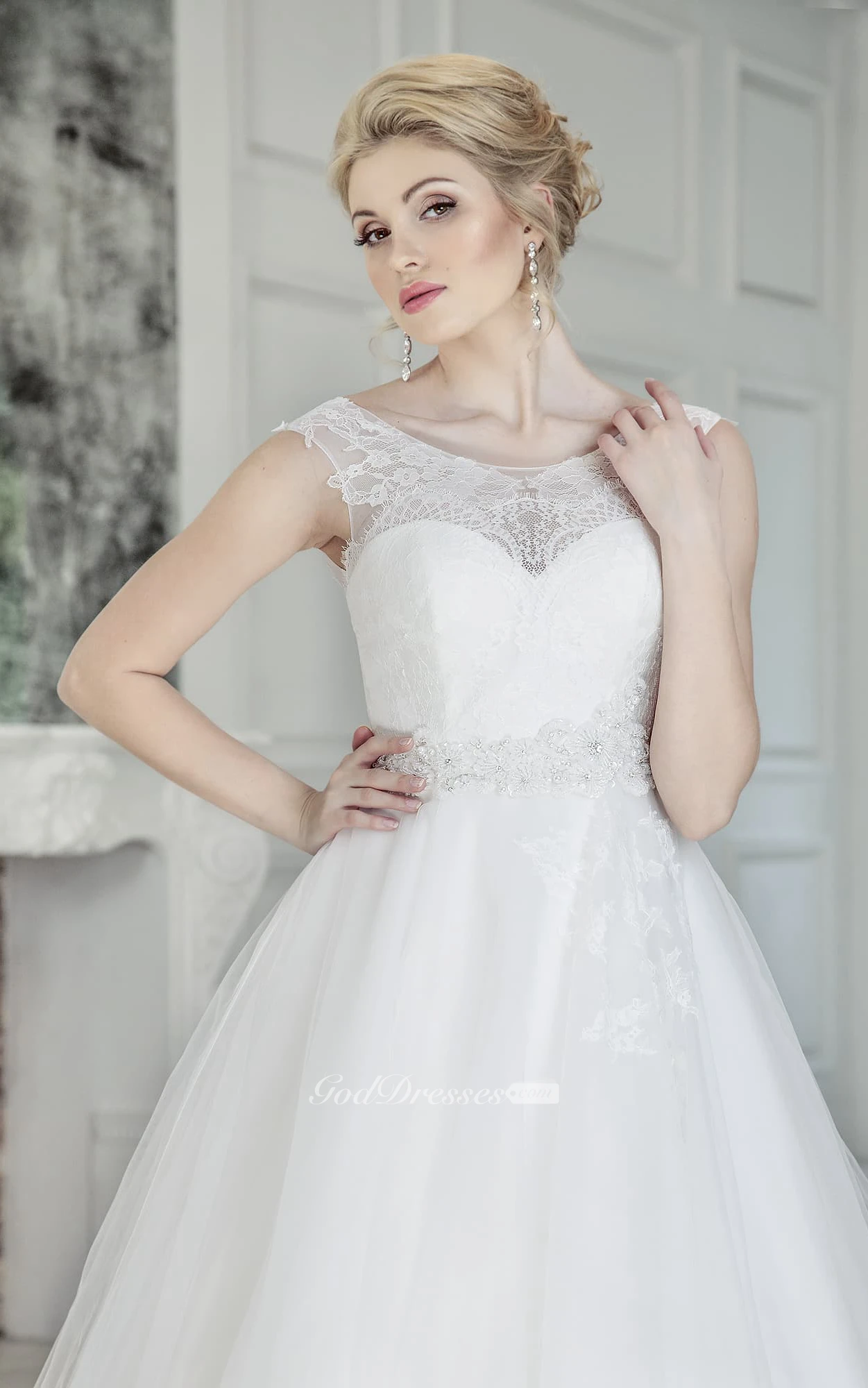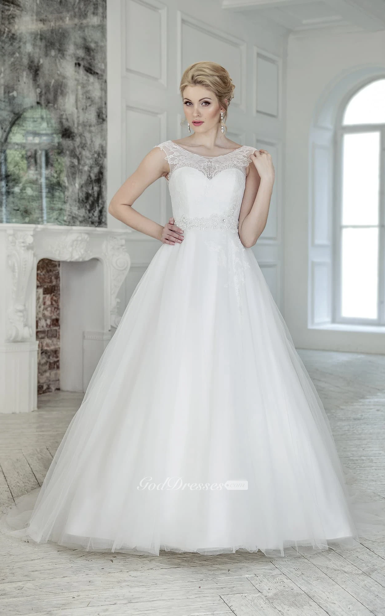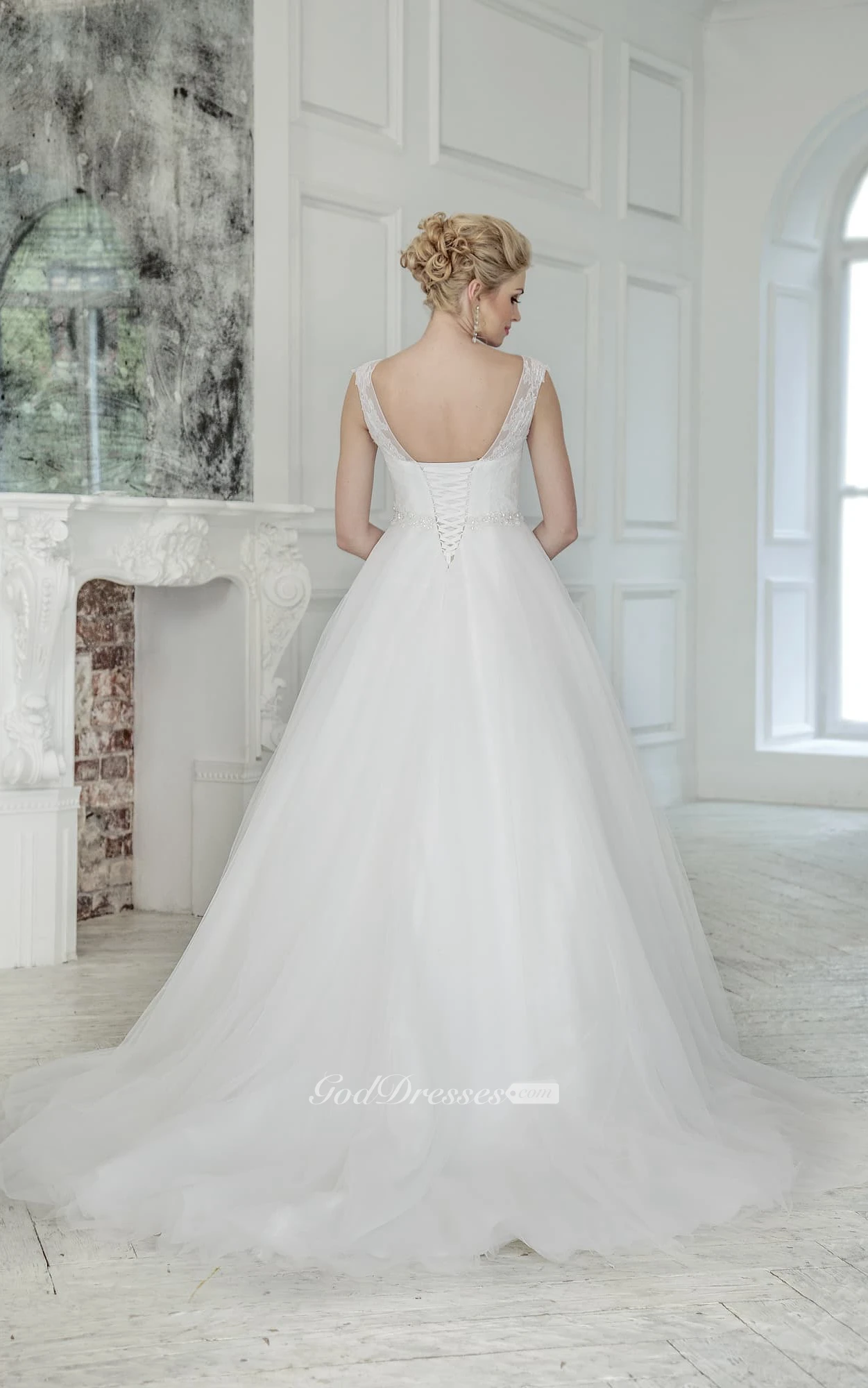 A-Line Floor-Length Scoop Cap-Sleeve Low-V-Back Tulle Dress With Lace And Beading