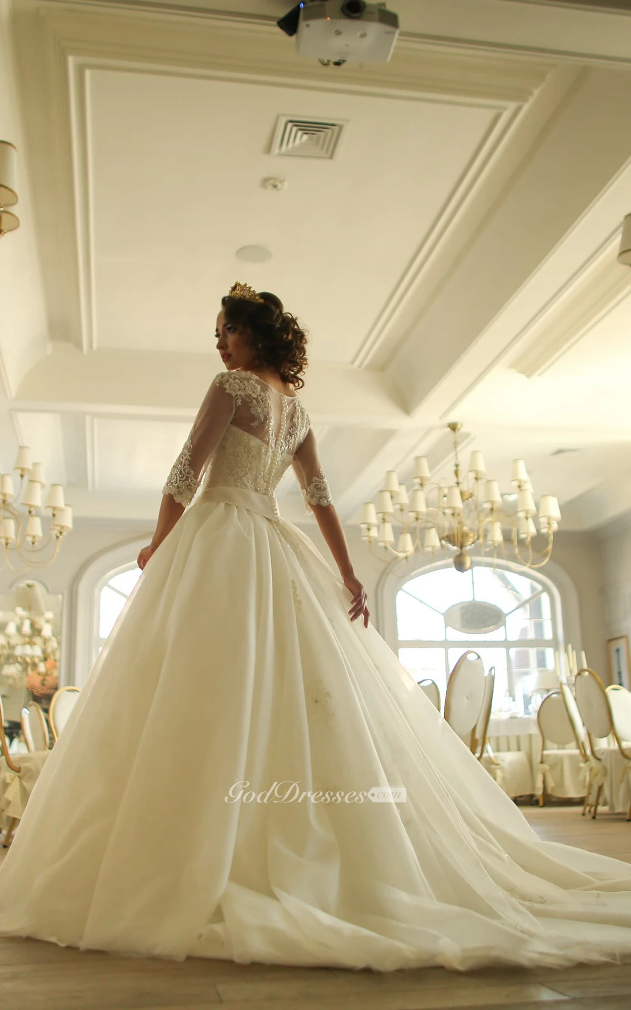A-Line Floor-Length Scoop Half-Sleeve Illusion Tulle Dress With Appliques