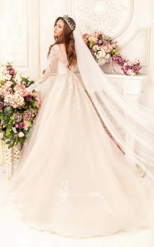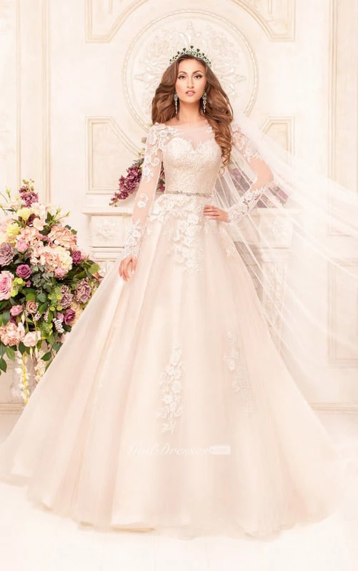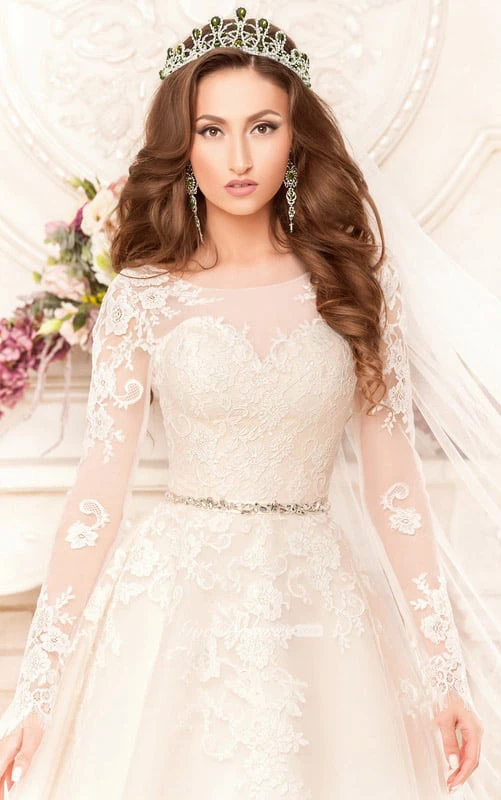A-Line Floor-Length Scoop Long-Sleeve Low-V-Back Lace Dress With Appliques And Waist Jewellery