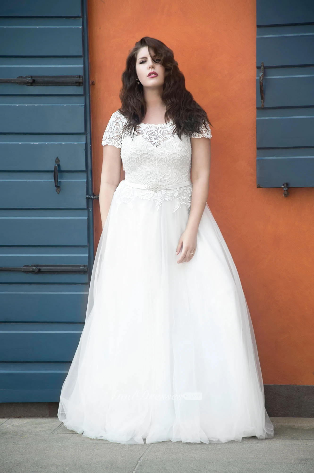 A-Line Floor-Length Scoop Neck Short Sleeve Tulle Appliques Dress