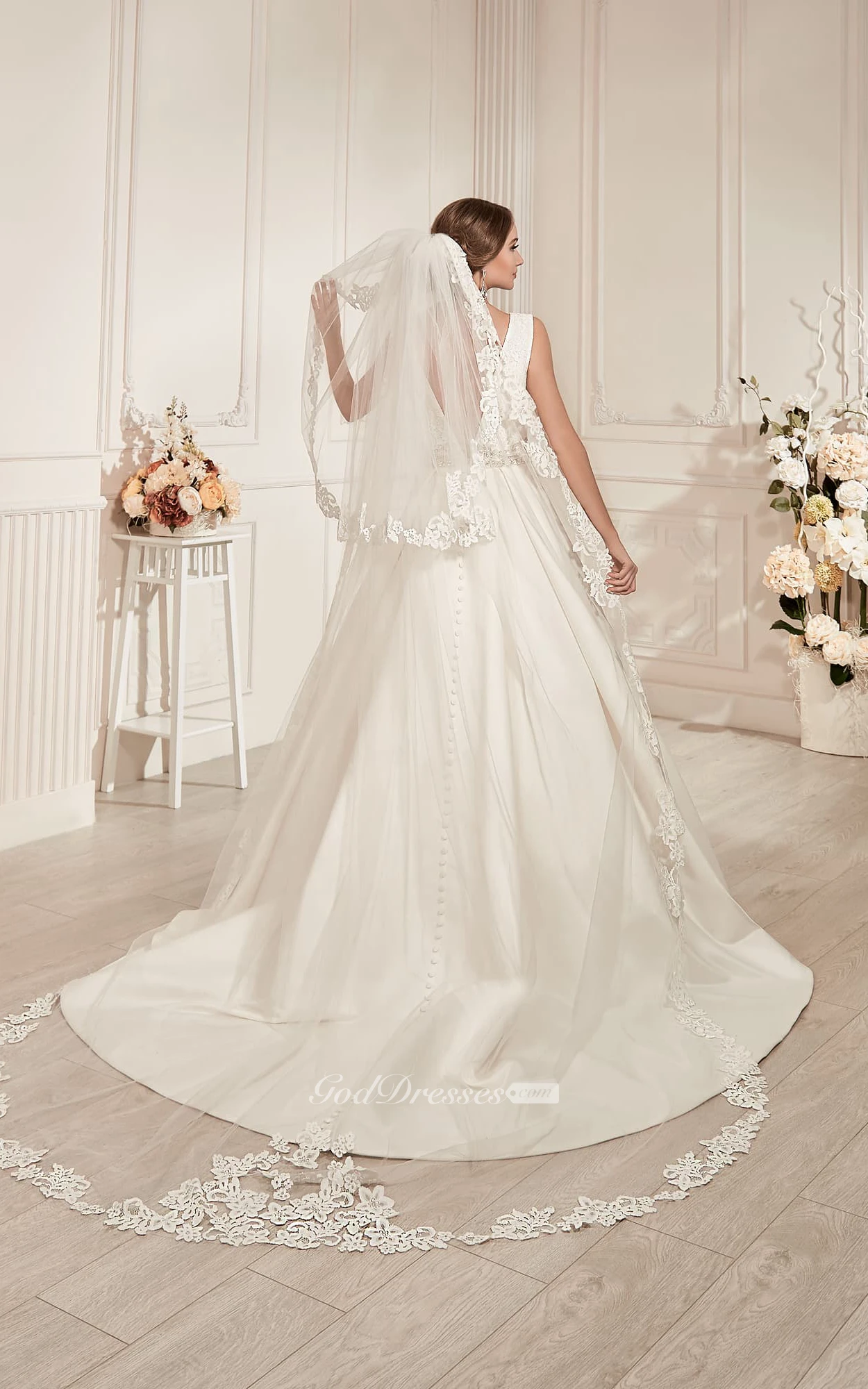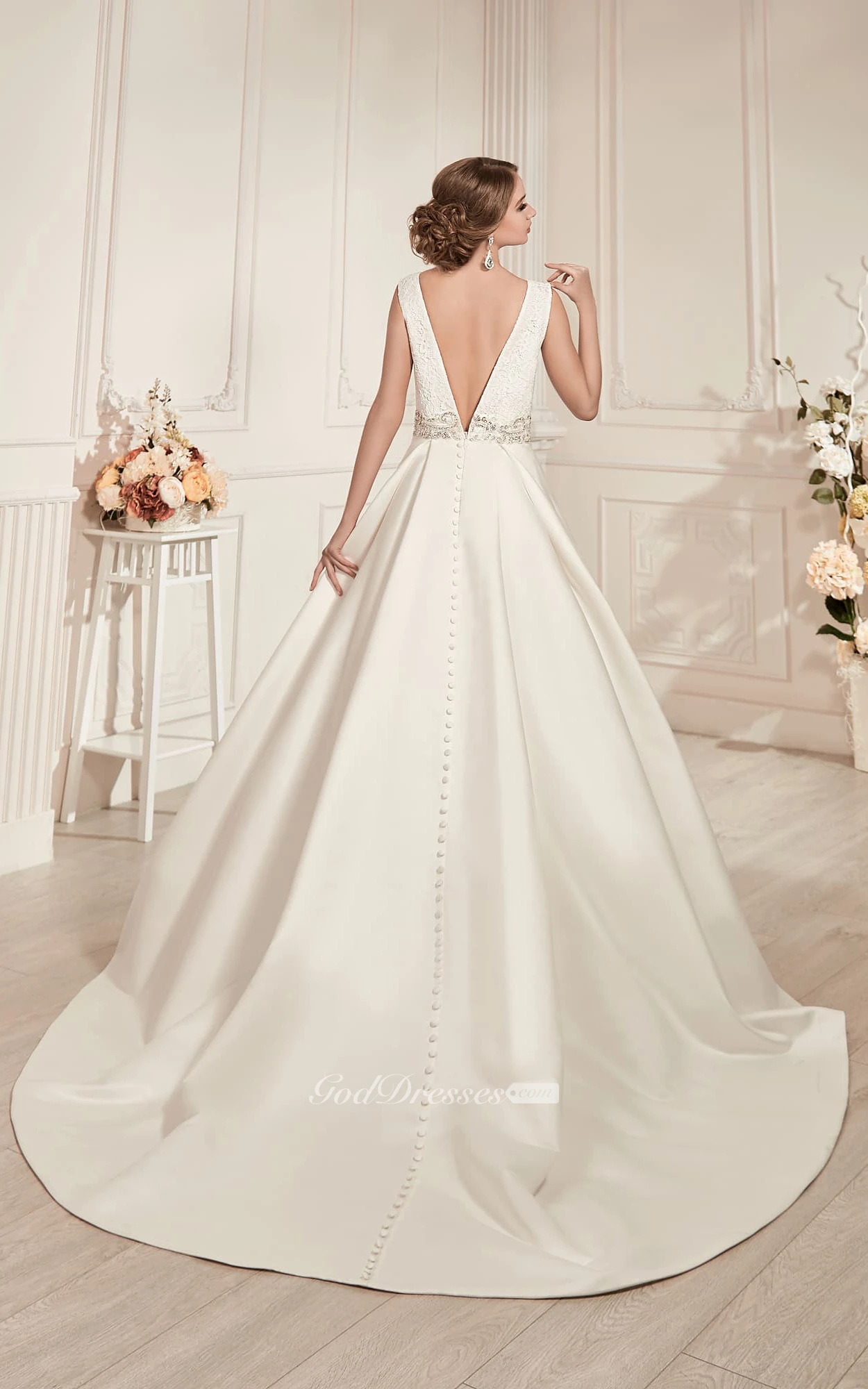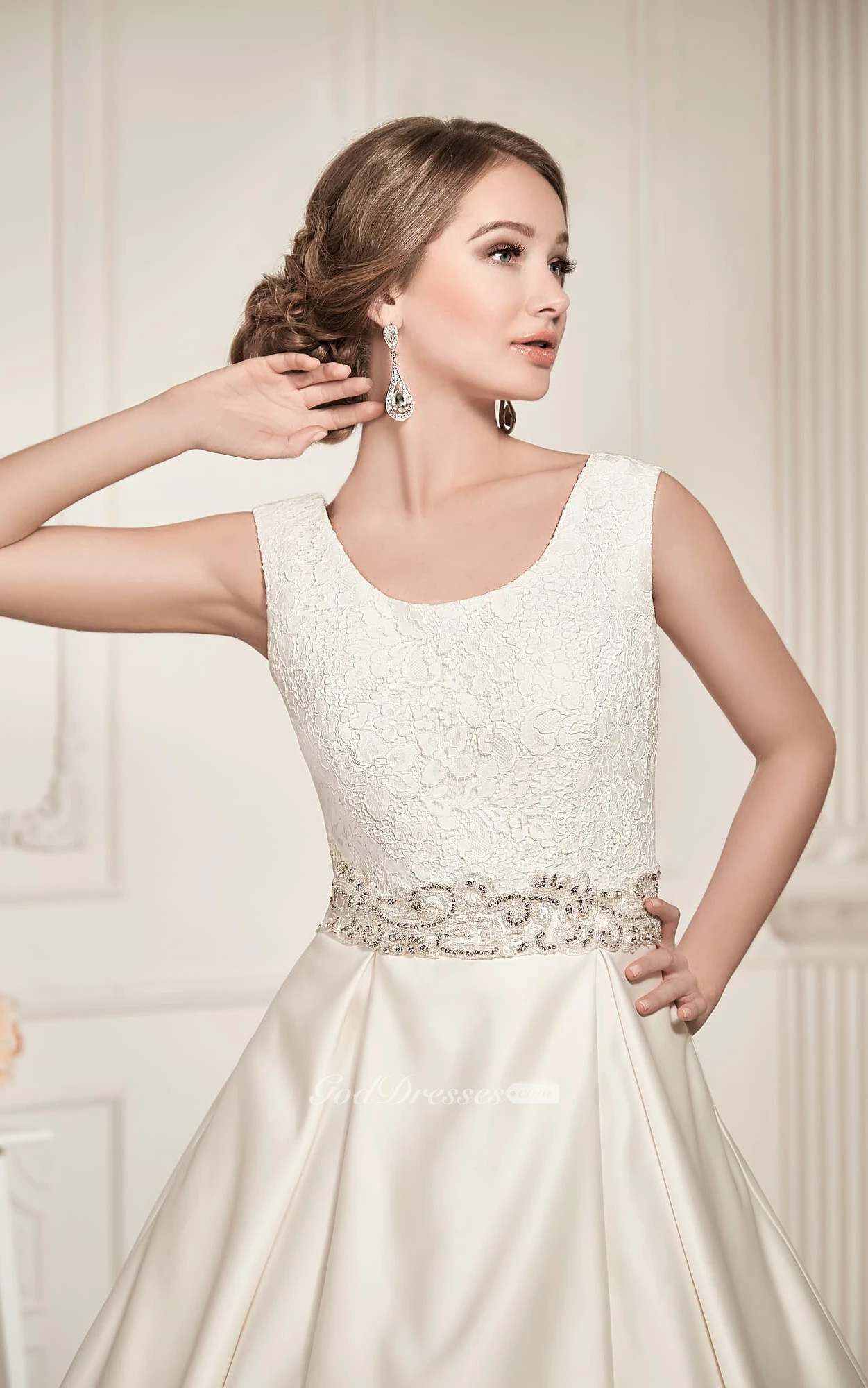 A-Line Floor-Length Scoop-Neck Sleeveless Low-V-Back Satin Dress With Beading