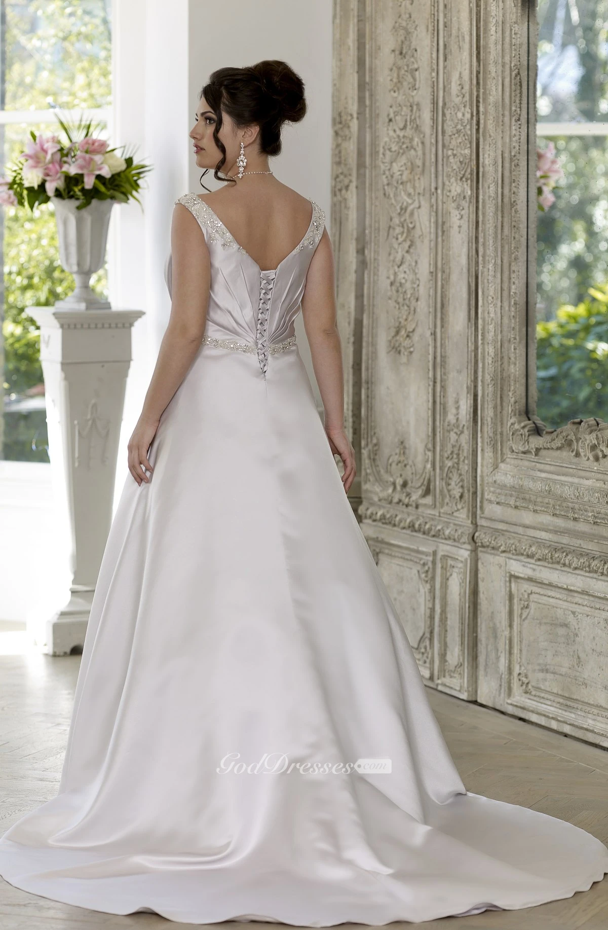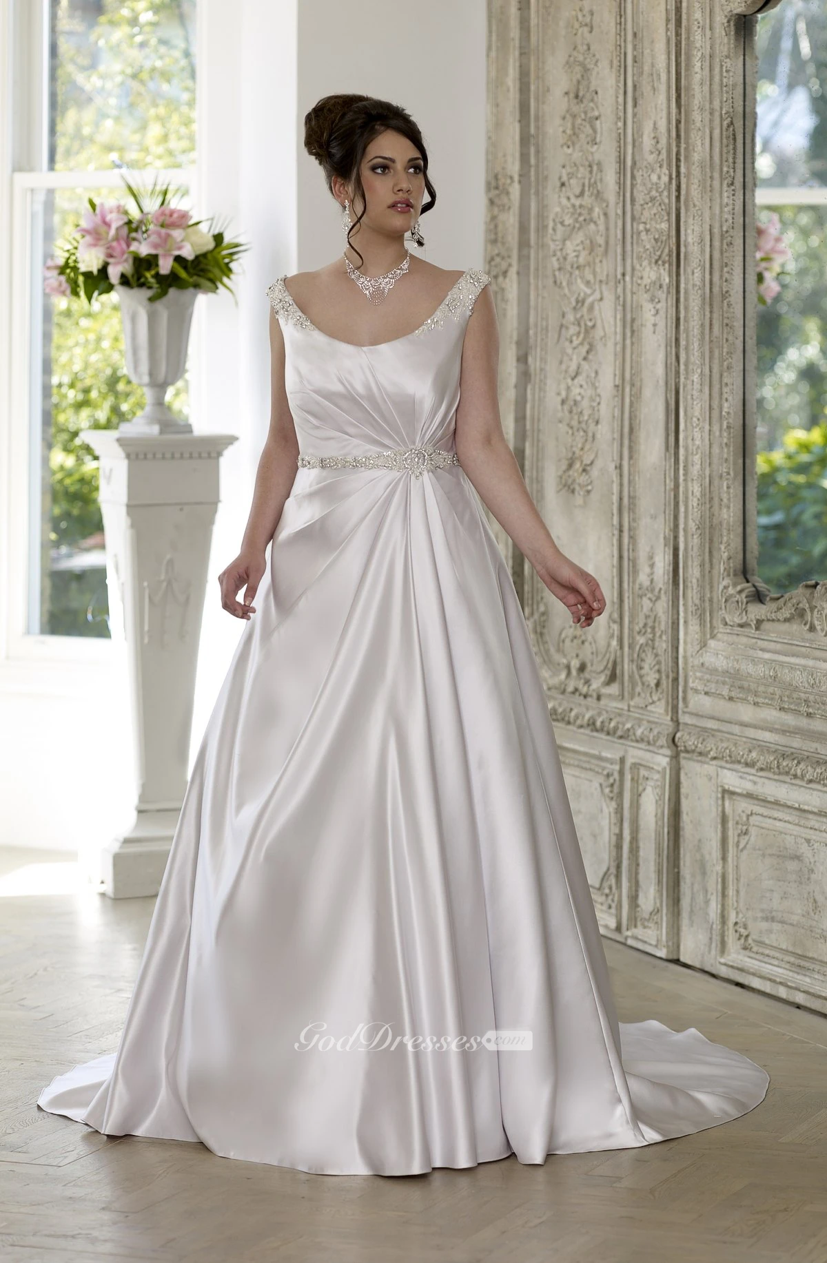 A-Line Floor-Length Scoop Neck Sleeveless Satin Court Train Lace-Up Back Draping Dress