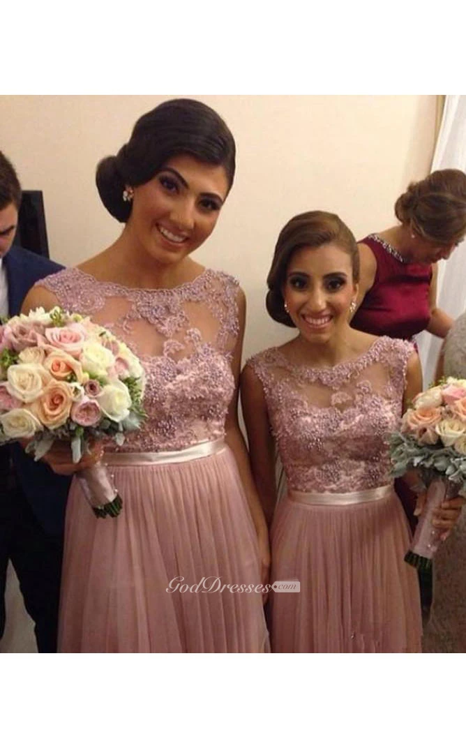 A-line Floor-length Scoop Sleeveless Cap Pleats Chiffon Lace Dress