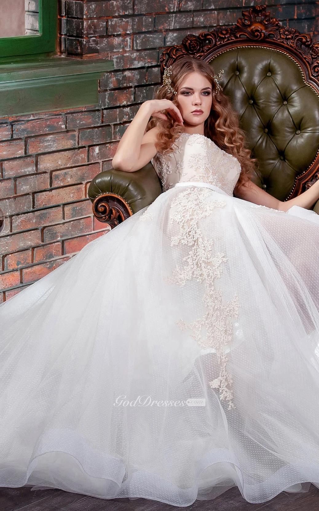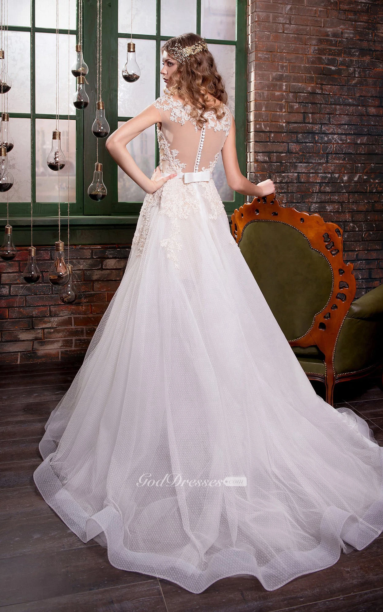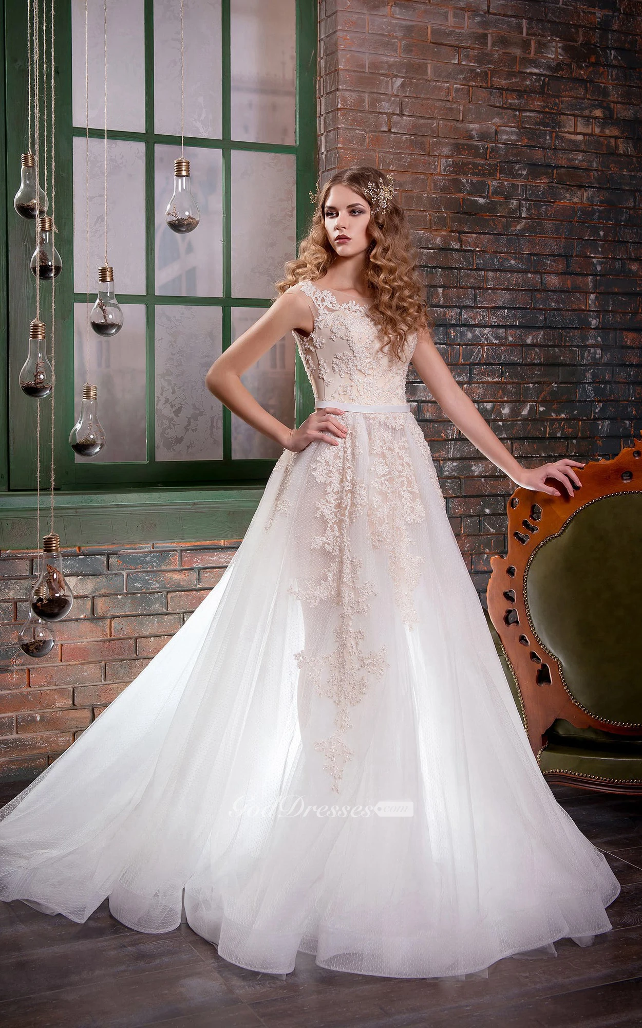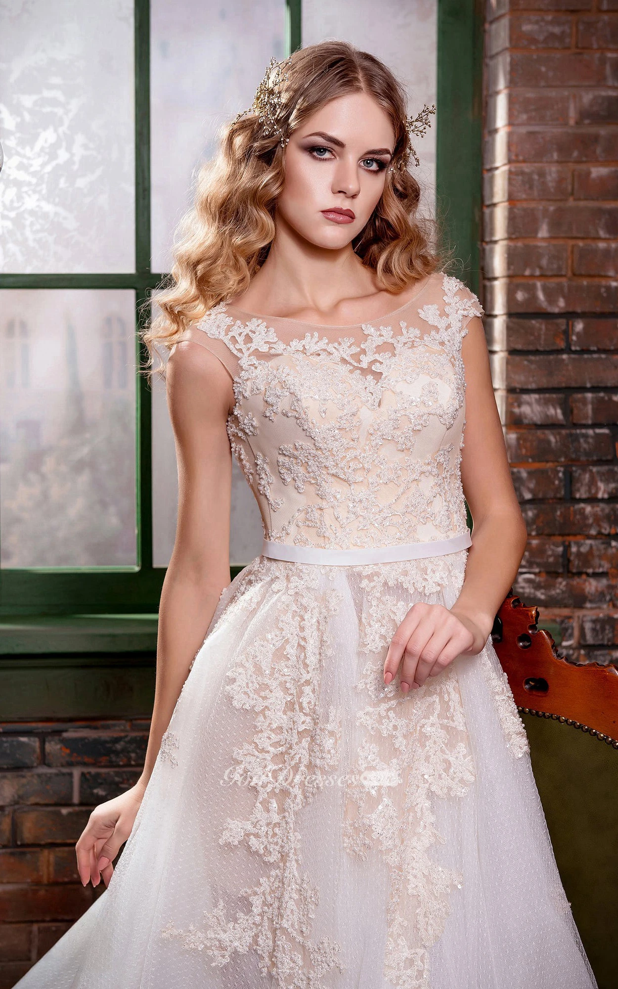 A-Line Floor-Length Scoop Sleeveless Illusion Tulle Dress With Appliques