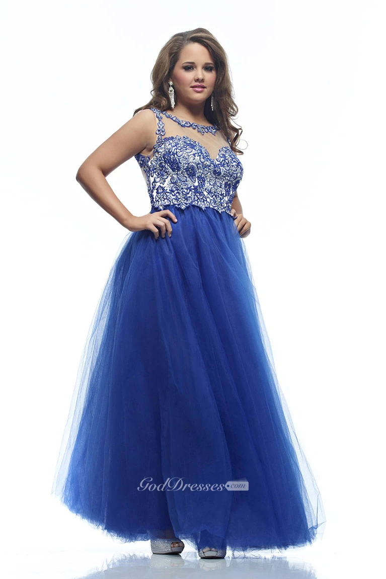 A-line Floor-length Scoop Sleeveless Tulle Appliques Pleats Illusion Dress