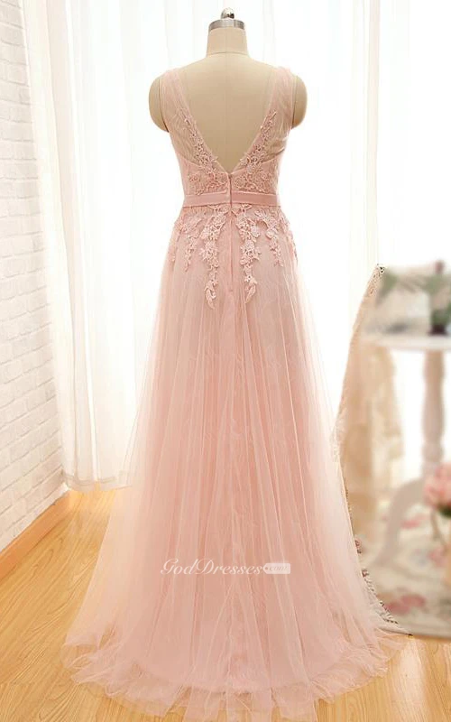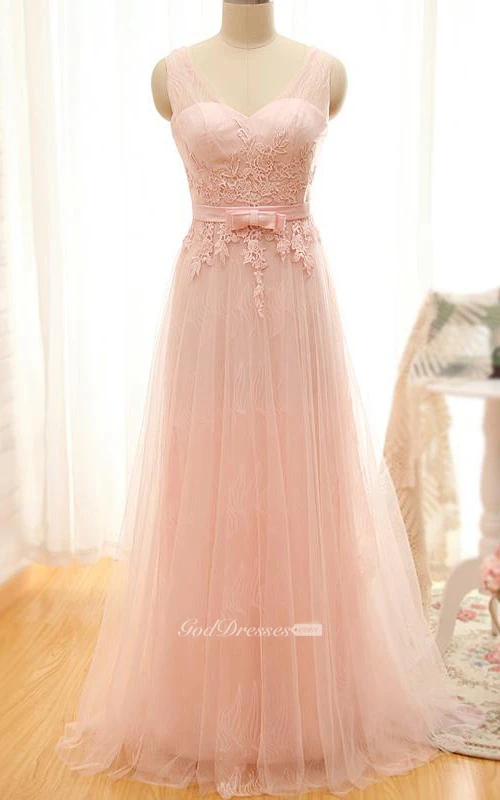 A-line Floor-length Sleeveless V-neck Tulle Dress