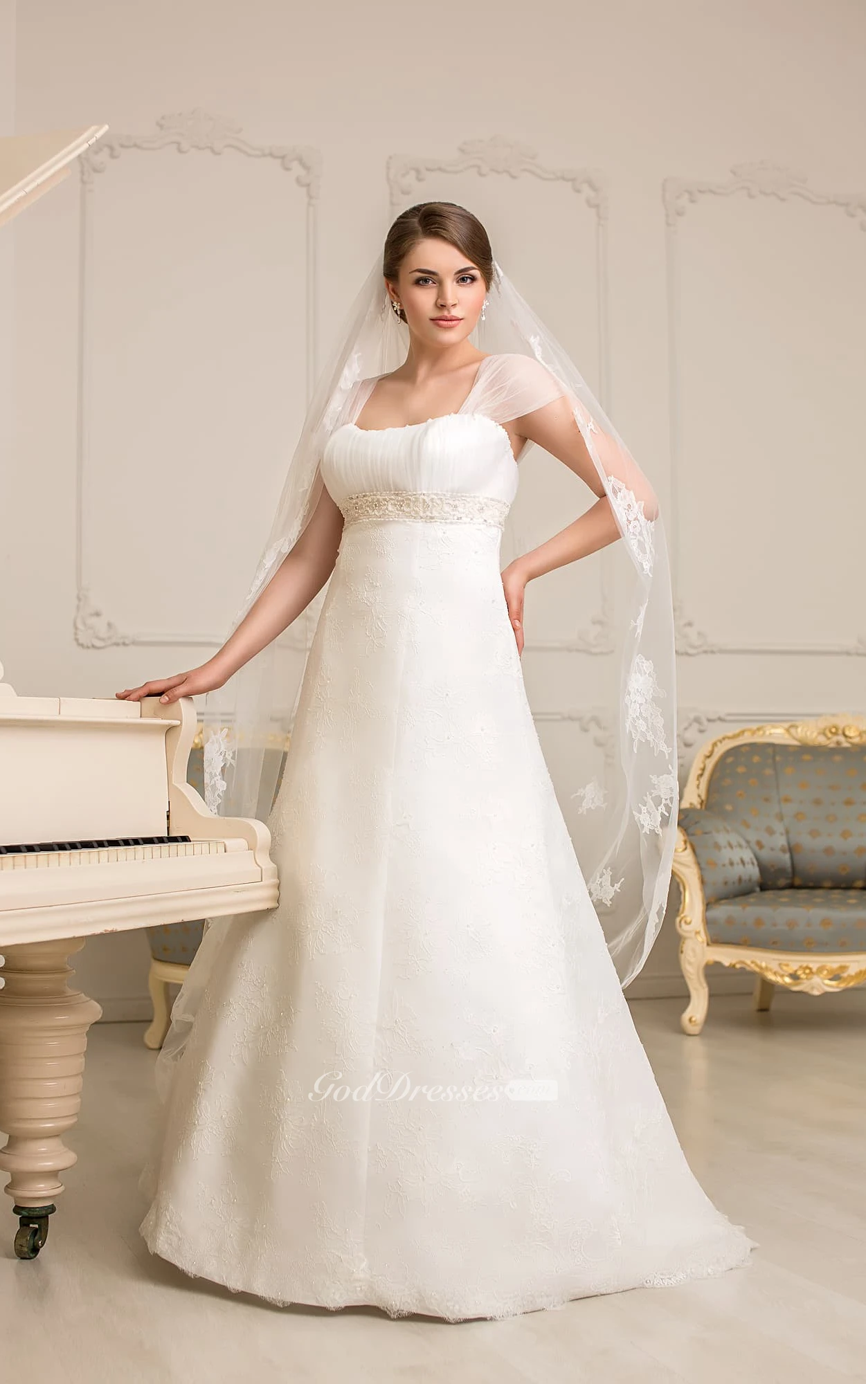 A-Line Floor-Length Square-Neck Cap-Sleeve Empire Corset-Back Lace Dress With Ruching And Beading