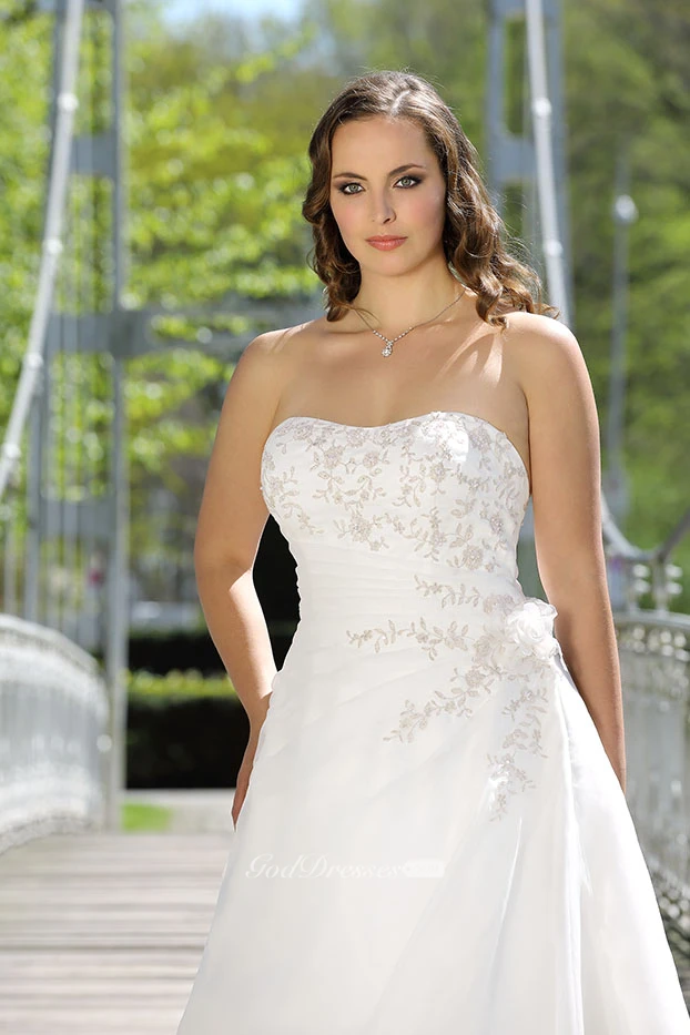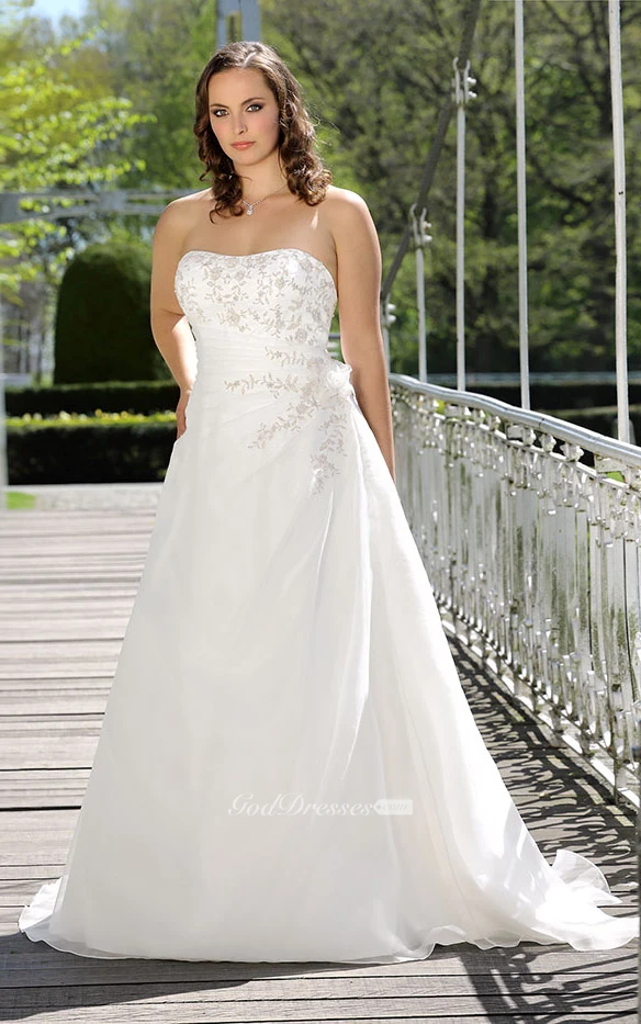 A-Line Floor-Length Strapless Cap Satin Draping Flower Sweep Train Draping Dress