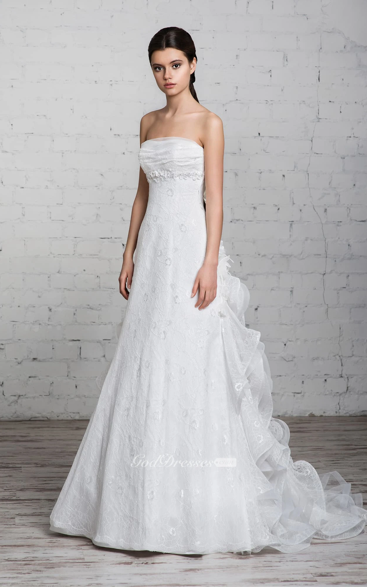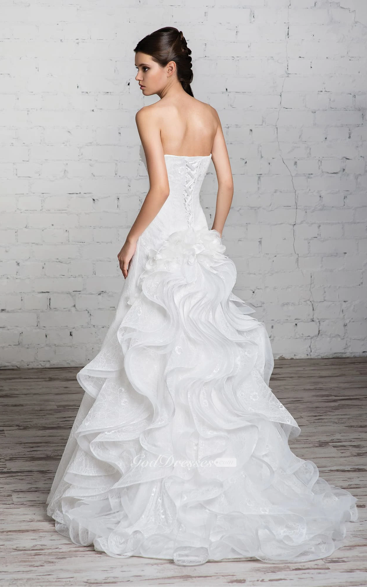 A-Line Floor-Length Strapless Sleeveless Corset-Back Lace Dress With Ruffles And Beading