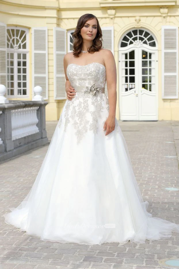A-Line Floor-Length Strapless Sleeveless Tulle Appliques Flower Sweep Train Appliques Dress