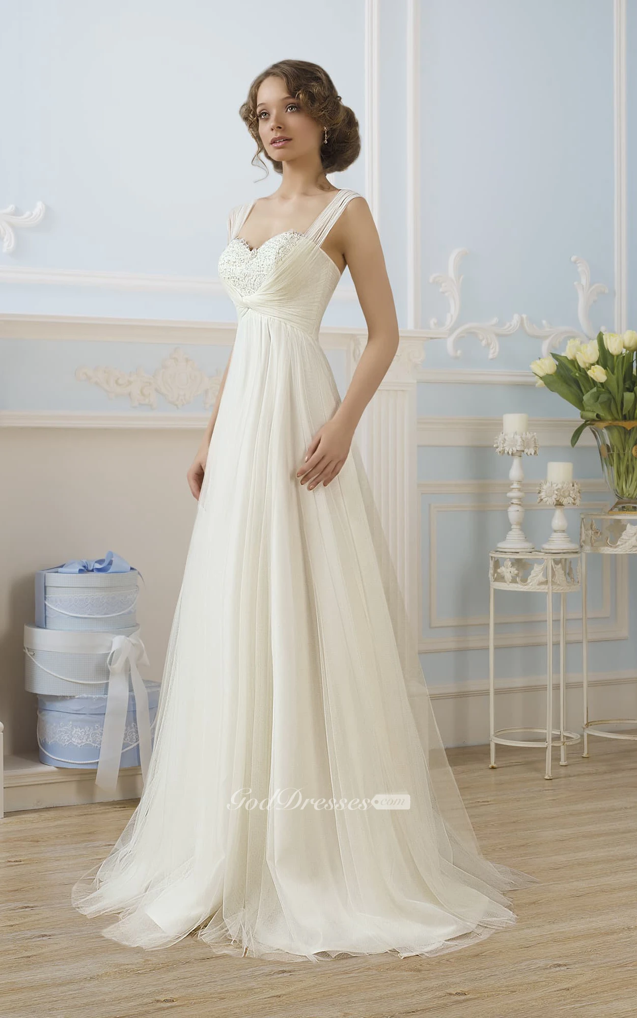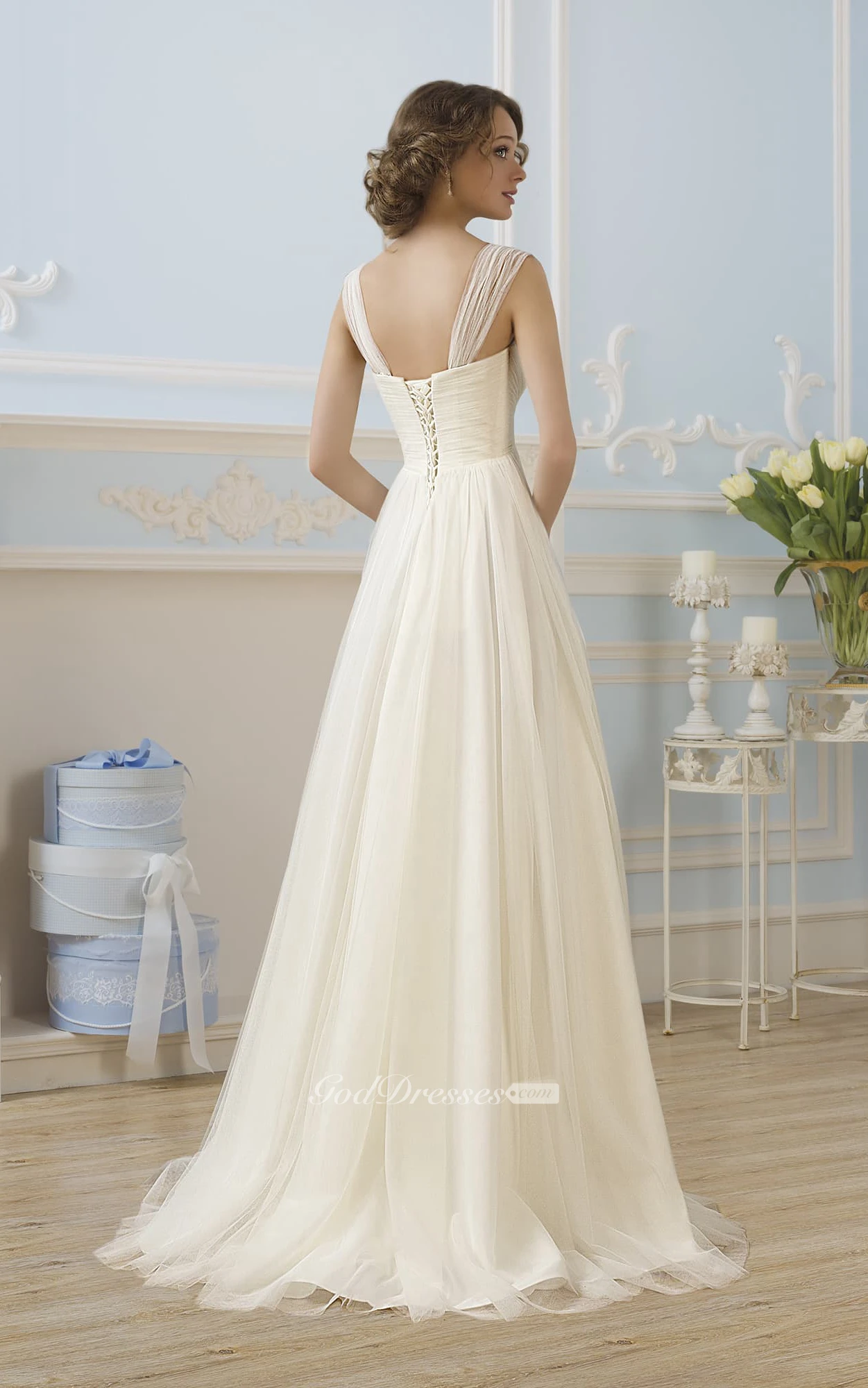 A-Line Floor-Length Straps Sleeveless Lace-Up Tulle Dress With Appliques And Pleats