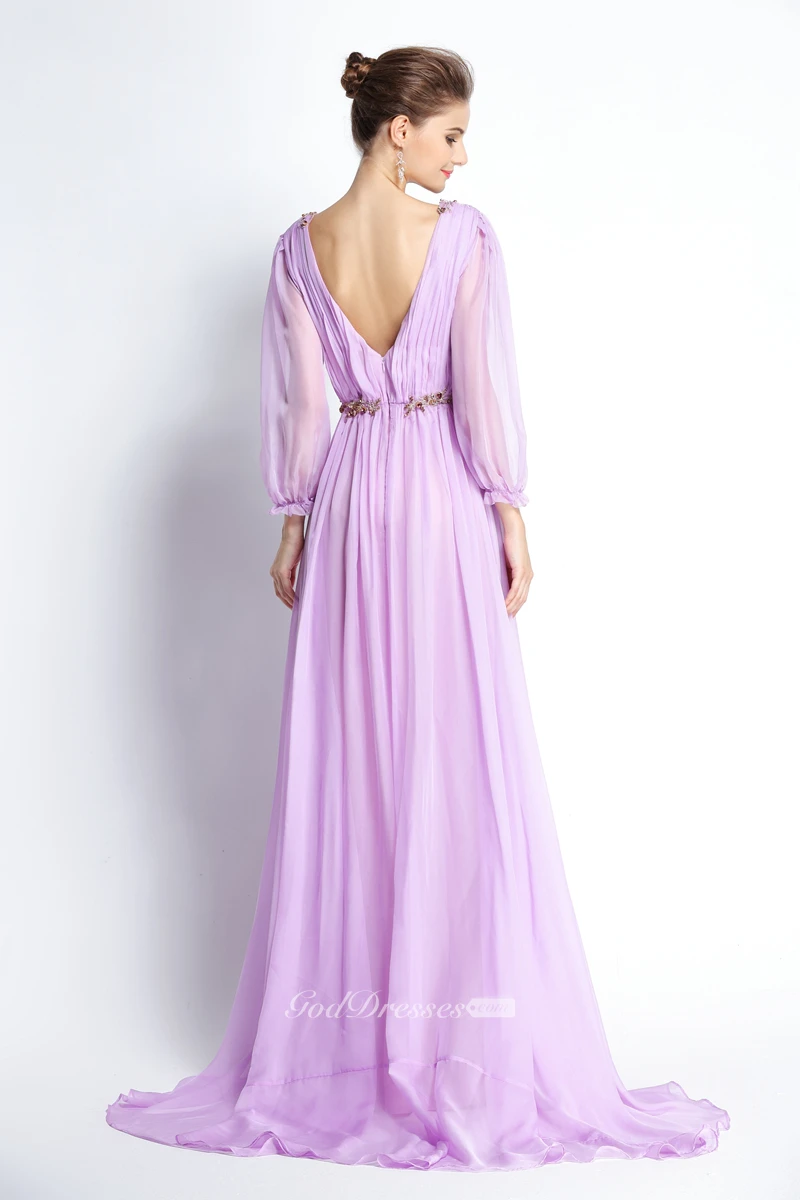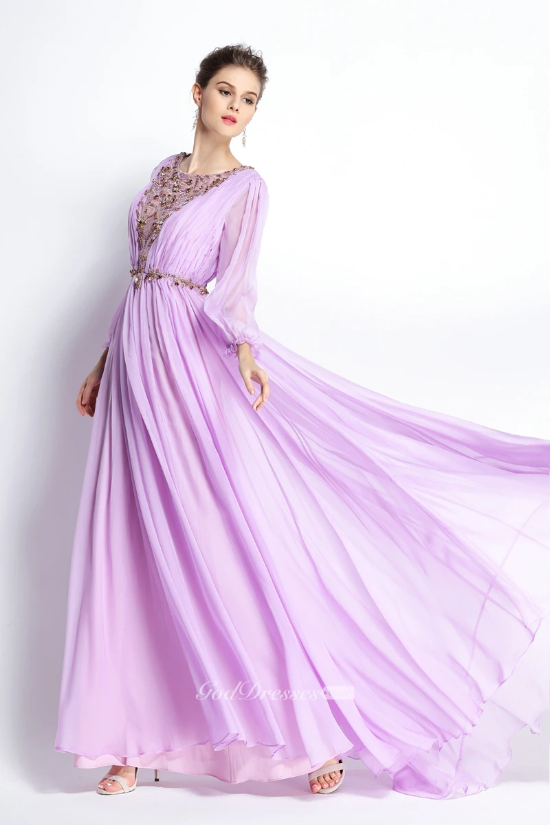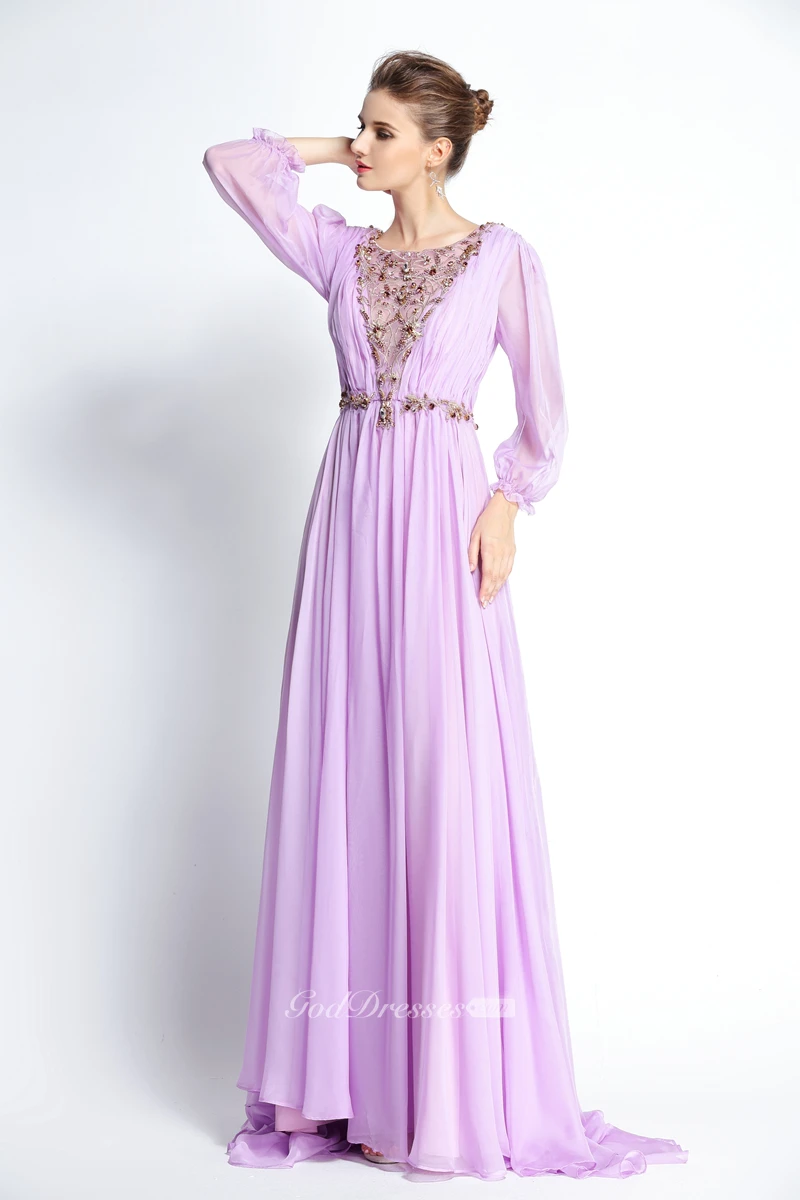 A-Line Floor-length Sweep Brush Train Bateau Chiffon Long Sleeve Prom Dress with Beading and Pleats