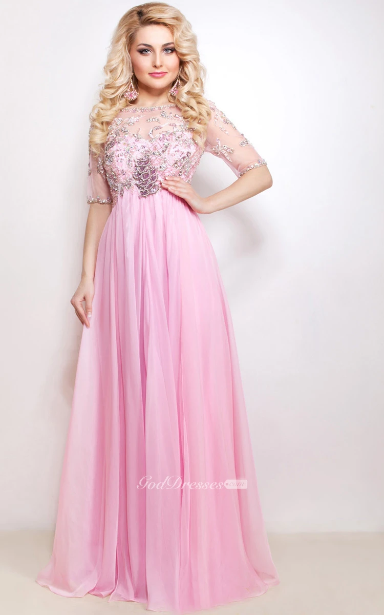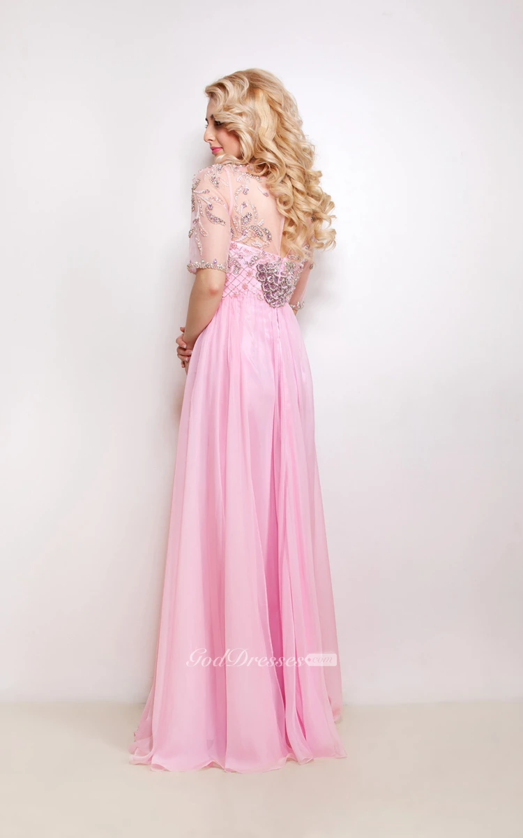 A-Line Floor-Length Sweep High-Neck Half Sleeve Empire Chiffon Beading Pleats Illusion Dress