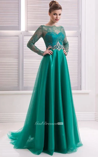 A-Line Floor-Length Sweep High-Neck Long Sleeve Tulle Beading Lace Zipper Dress