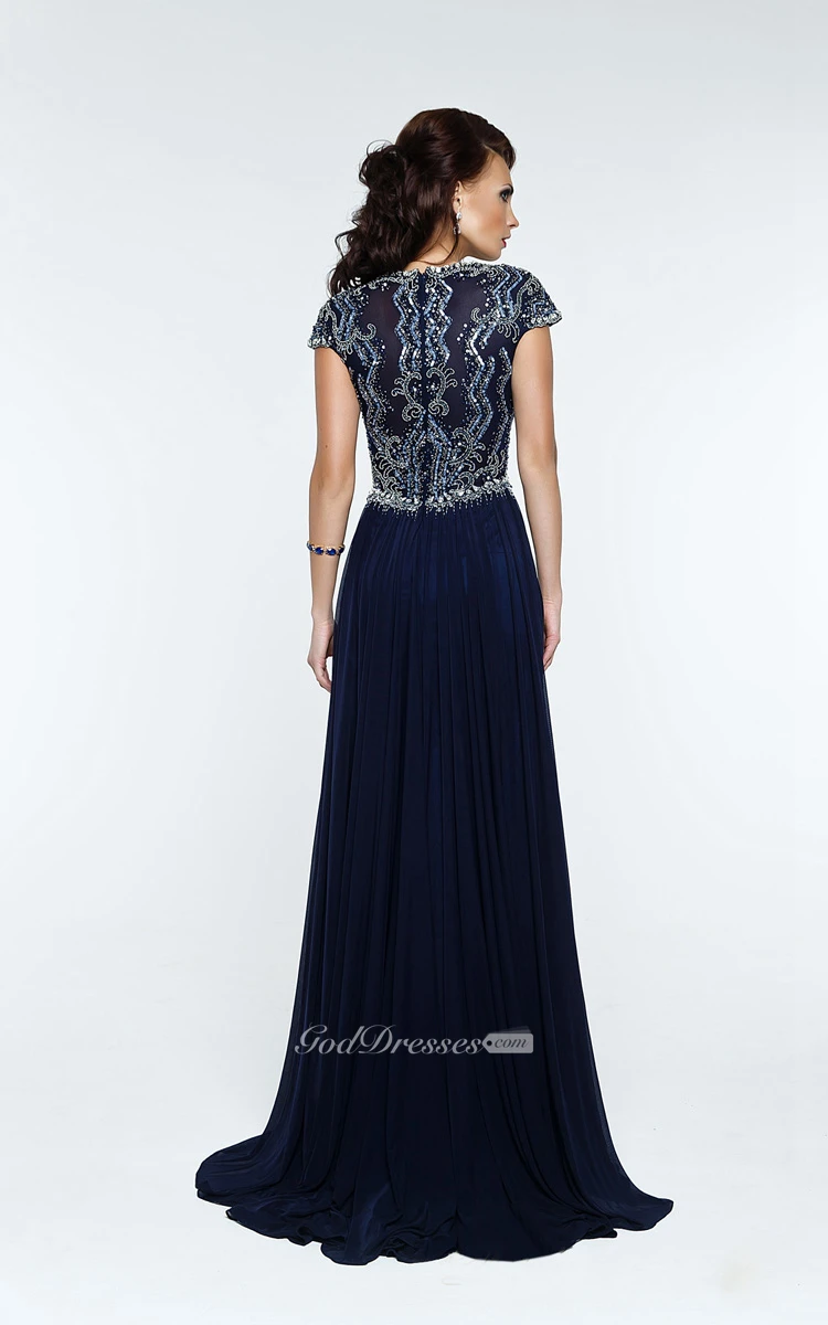 A-Line Floor-Length Sweep Queen Anne Short Sleeve Chiffon Beading Pleats Zipper Dress