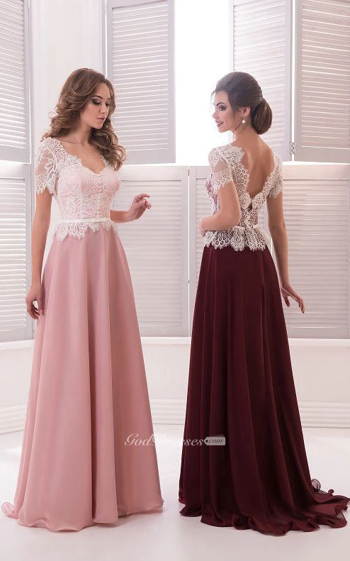 A-Line Floor-Length Sweep V-Neck Short Sleeve Chiffon Lace Ruffles Low-V Back Dress