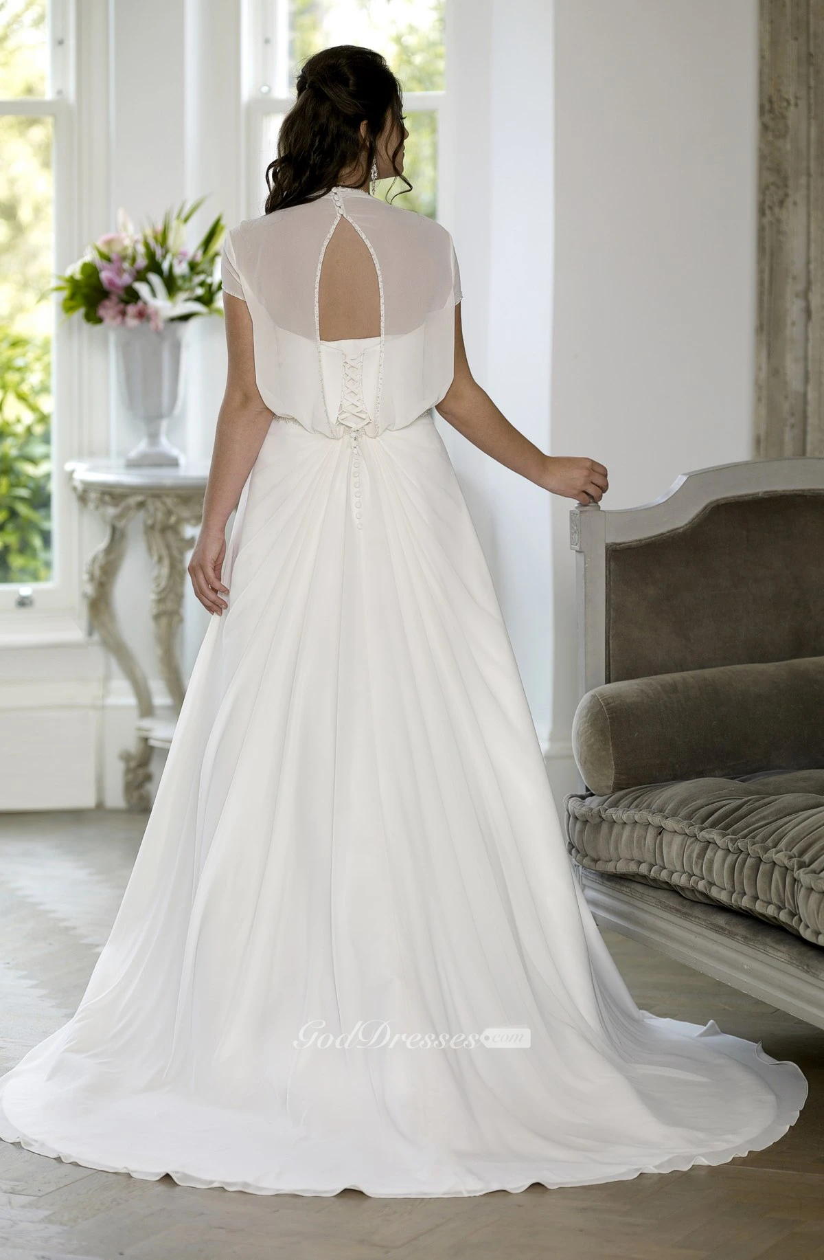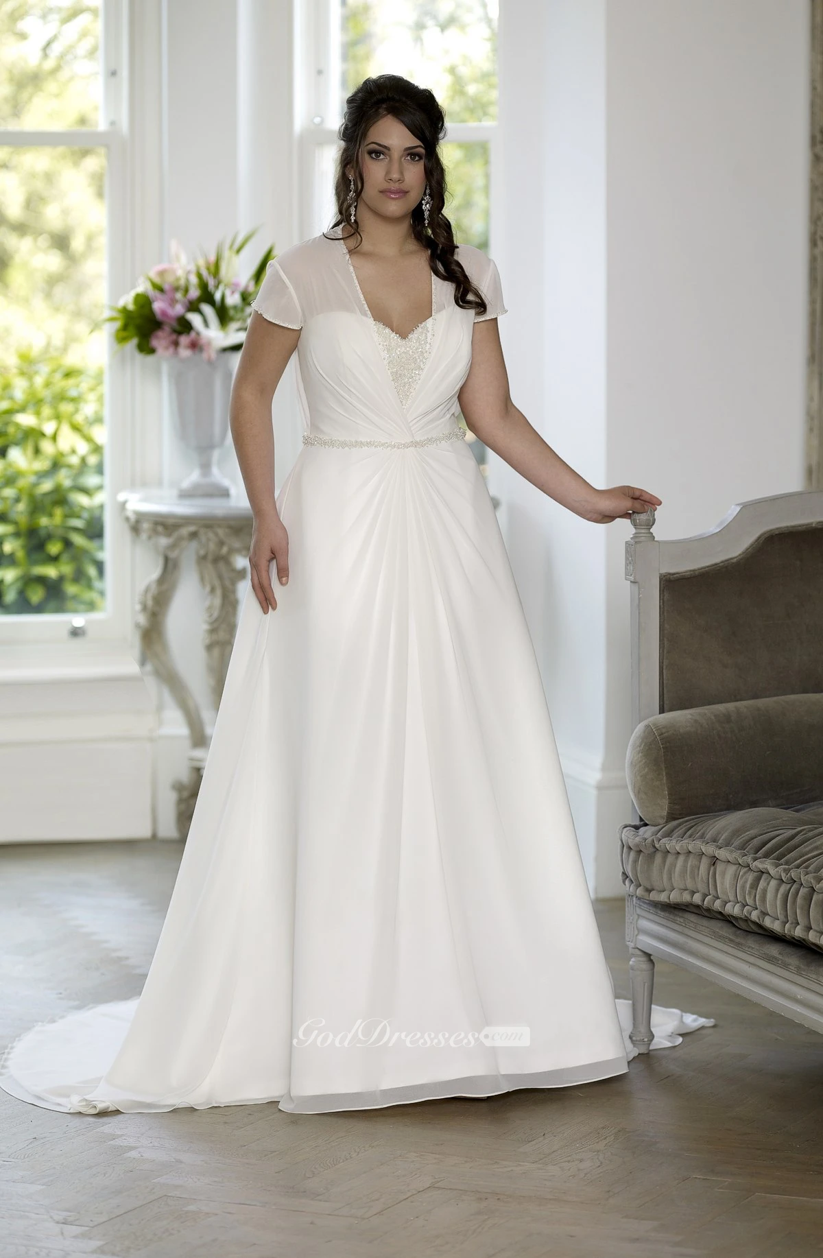 A-Line Floor-Length Sweetheart Short Sleeve Chiffon Satin Court Train Lace-Up Back Beading Dress