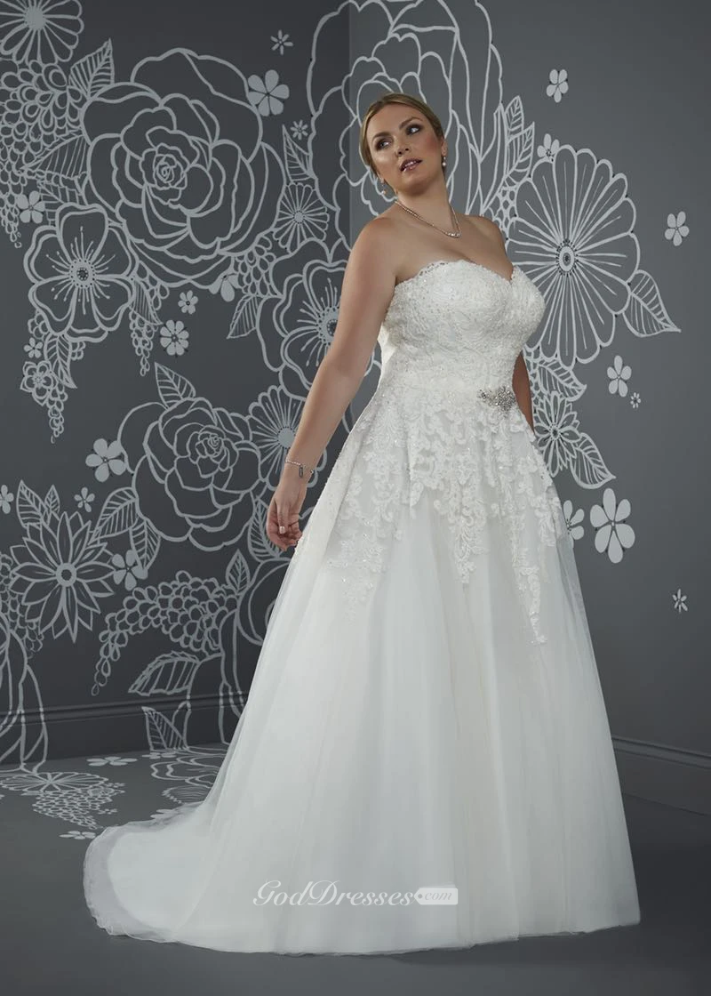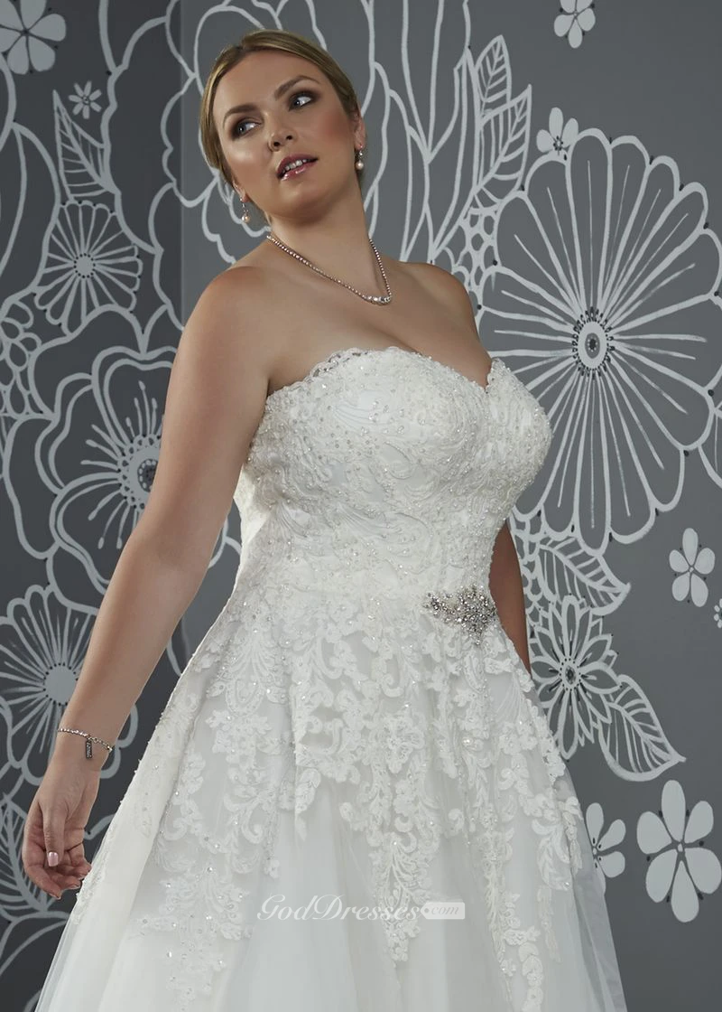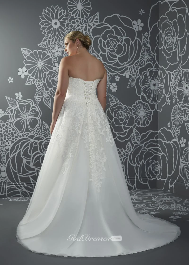A-Line Floor-Length Sweetheart Sleeveless Satin Court Train Lace-Up Back Appliques Dress