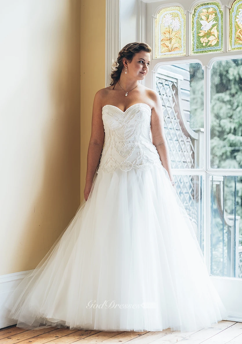 A-Line Floor-Length Sweetheart Sleeveless Tulle Court Train Backless Beading Dress