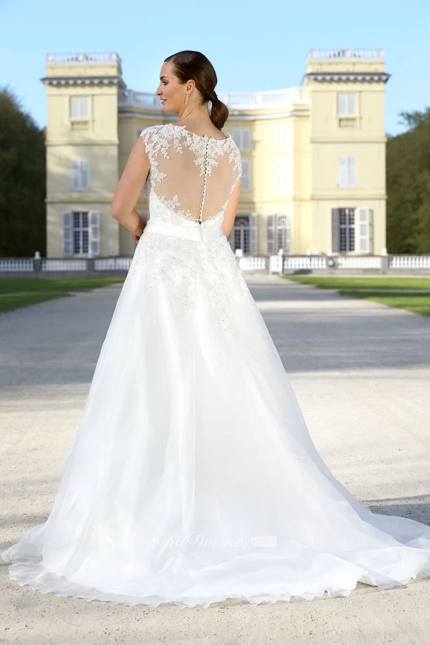 A-Line Floor-Length V-Neck Cap Satin Bow Appliques Sweep Train Illusion Bow Dress