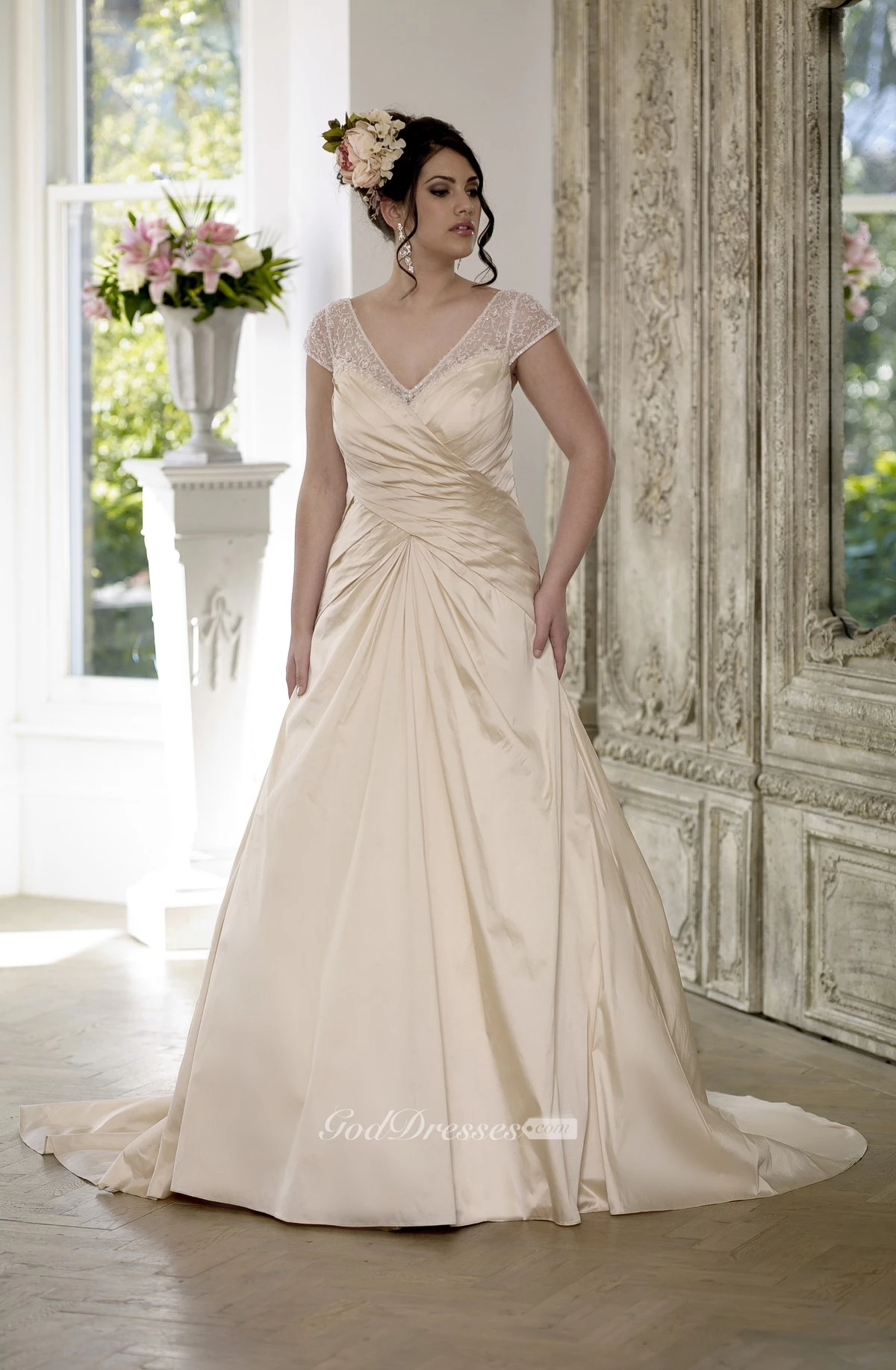A-Line Floor-Length V-Neck Cap Satin Court Train Lace-Up Back Lace Dress
