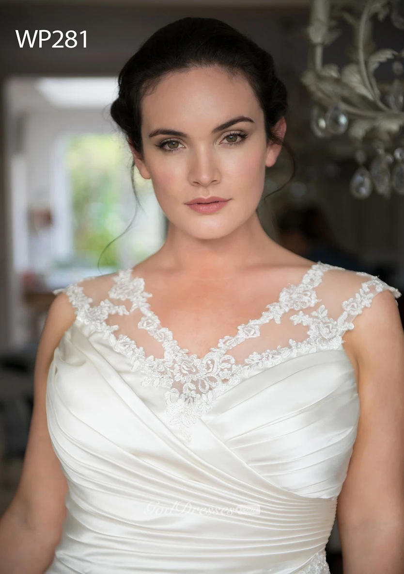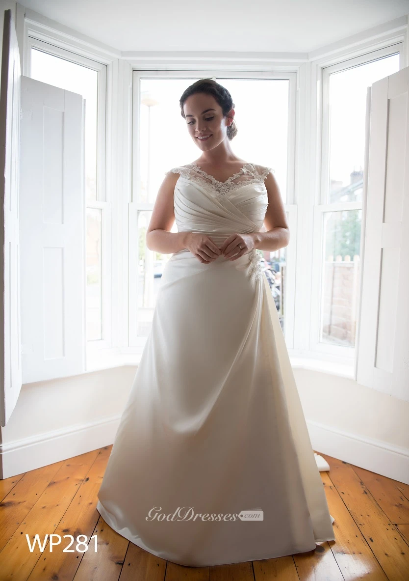A-Line Floor-Length V-Neck Cap Satin Sweep Train Side Draping Dress