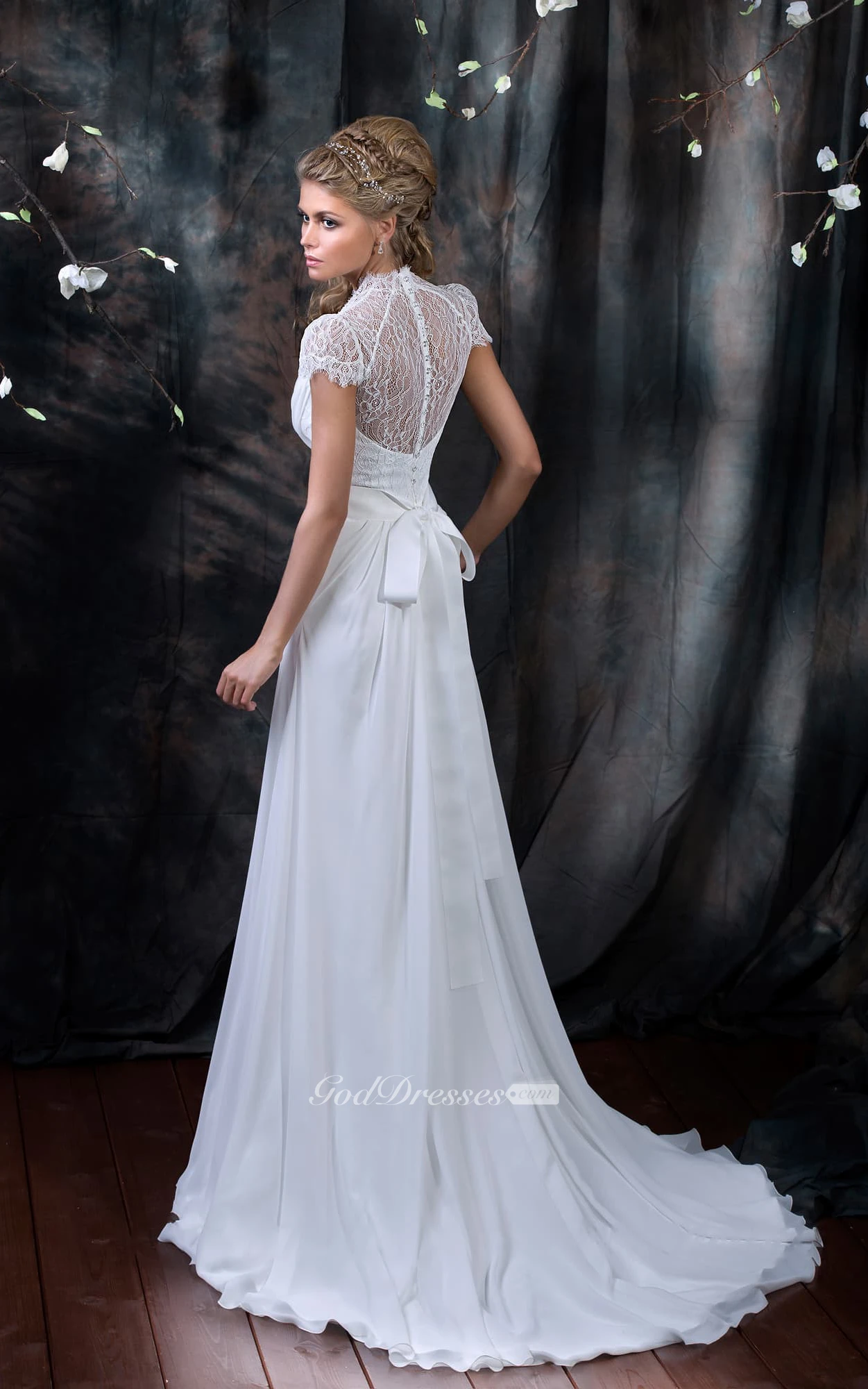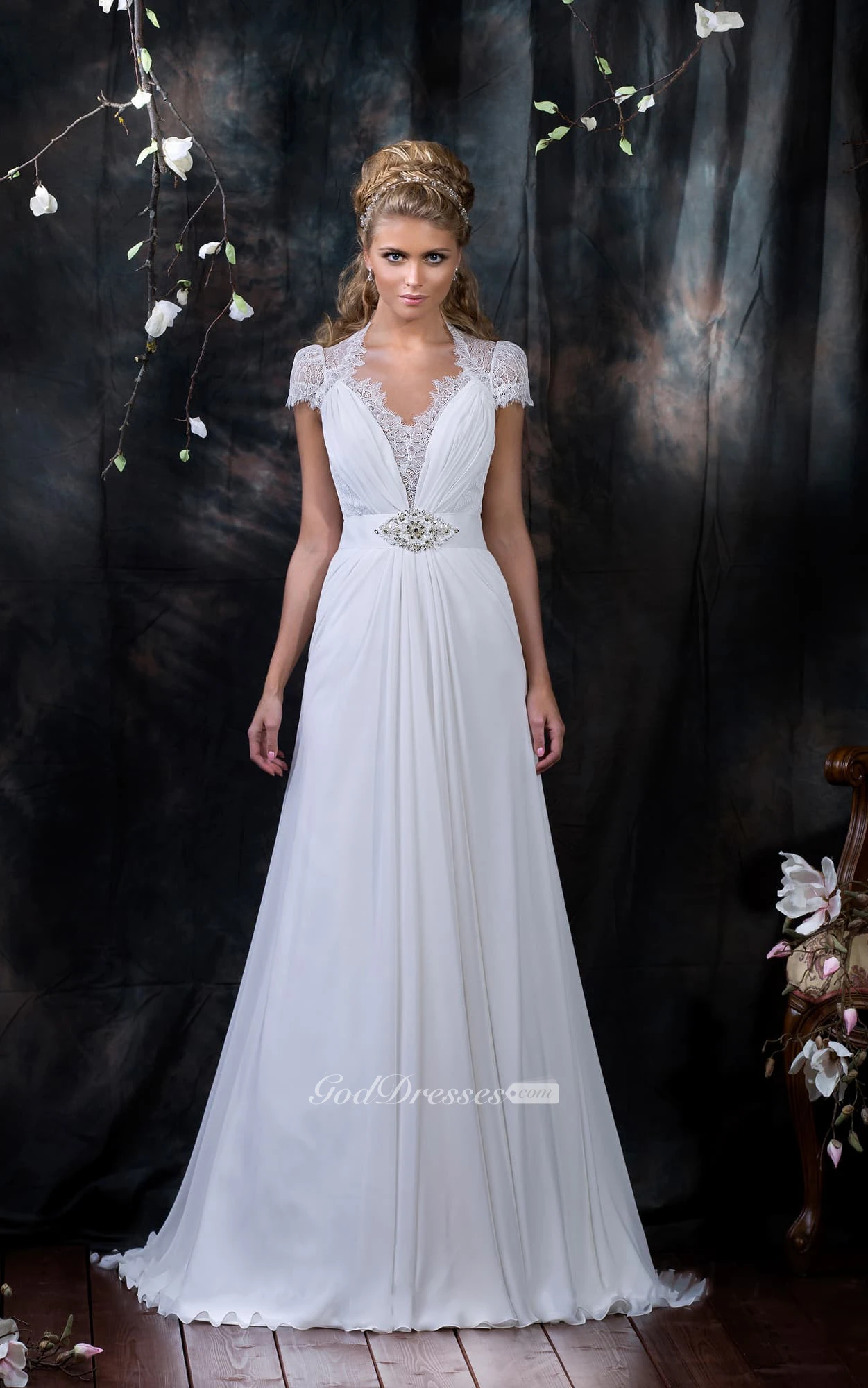 A-Line Floor-Length V-Neck Cap-Sleeve Illusion Chiffon Dress With Lace And Beading