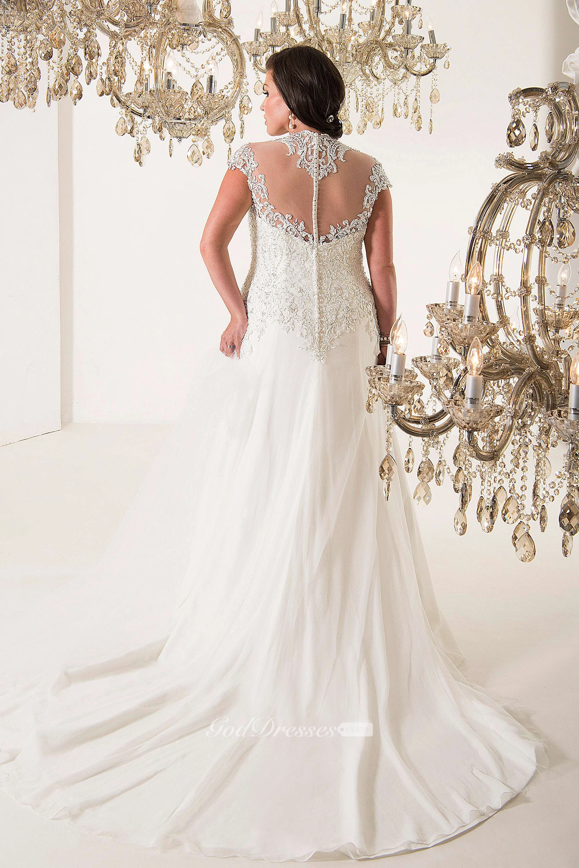 A-Line Floor-Length V-Neck Cap Tulle Chiffon Court Train Illusion Beading Dress