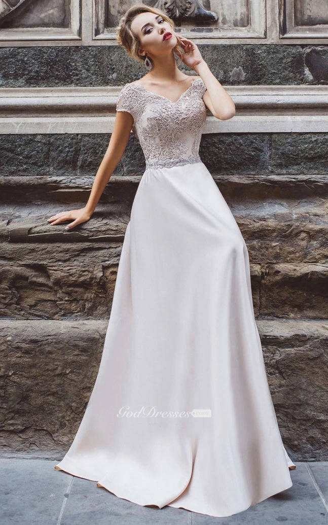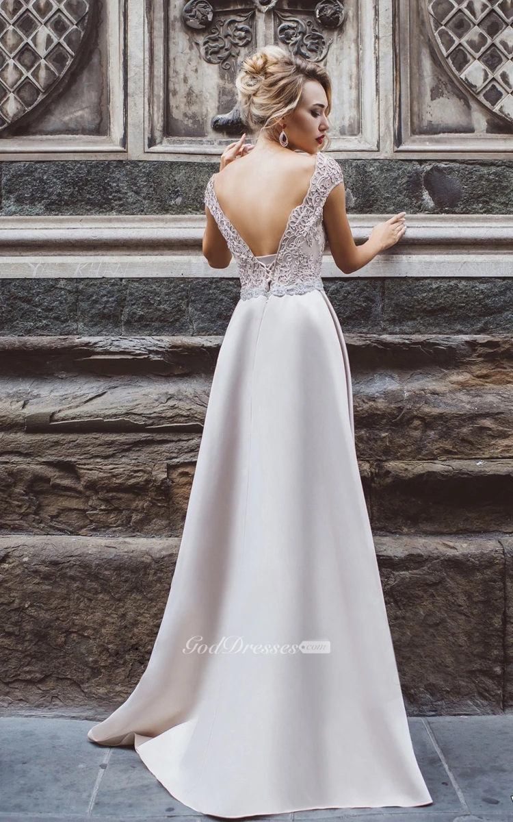 A-Line Floor-Length V-Neck Short Sleeve Jersey Appliques Pleats Low-V Back Dress
