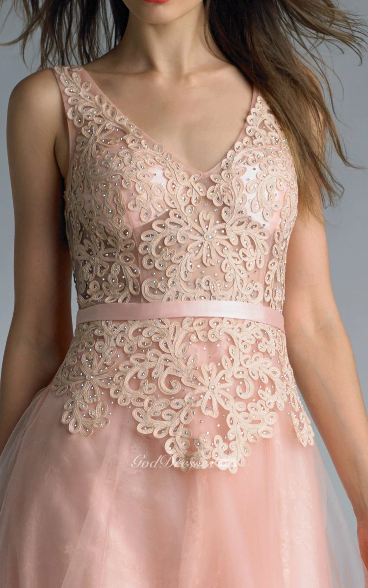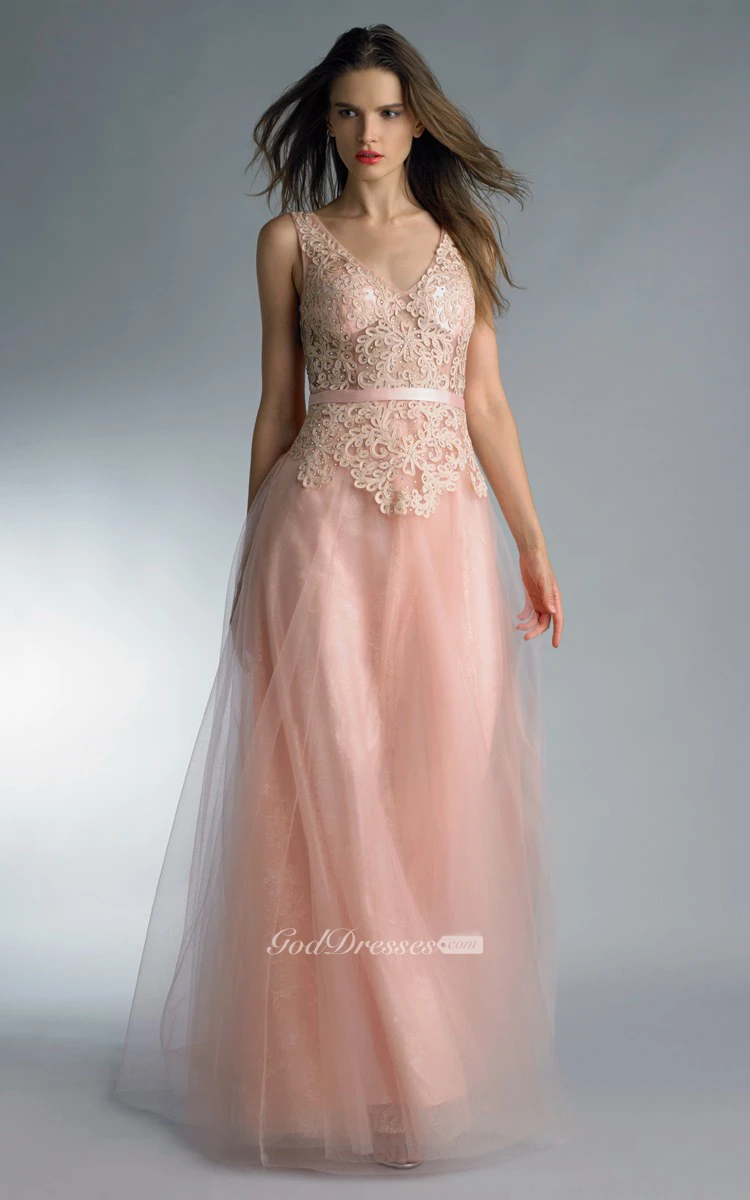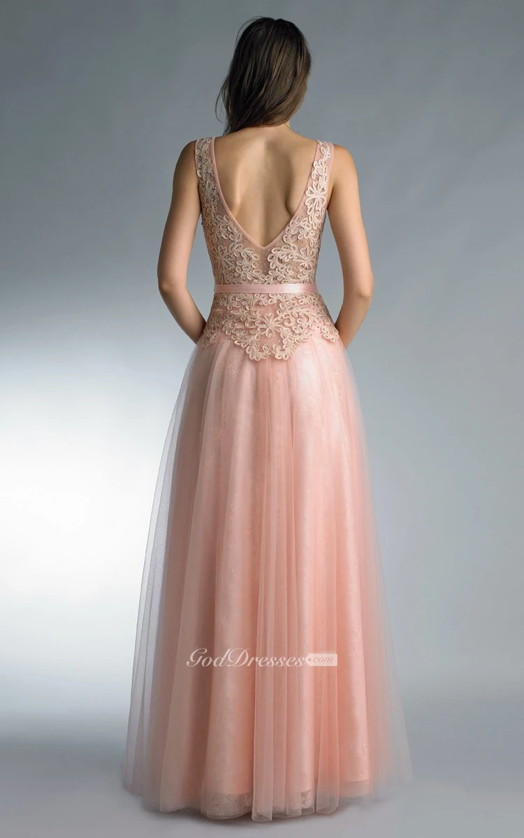 A-line Floor-length V-neck Sleeveless Tulle Low-V Back Dress