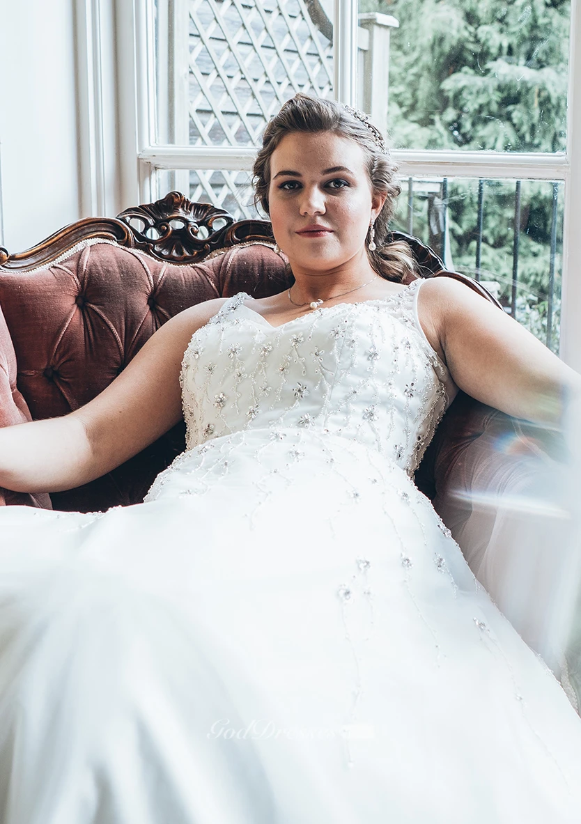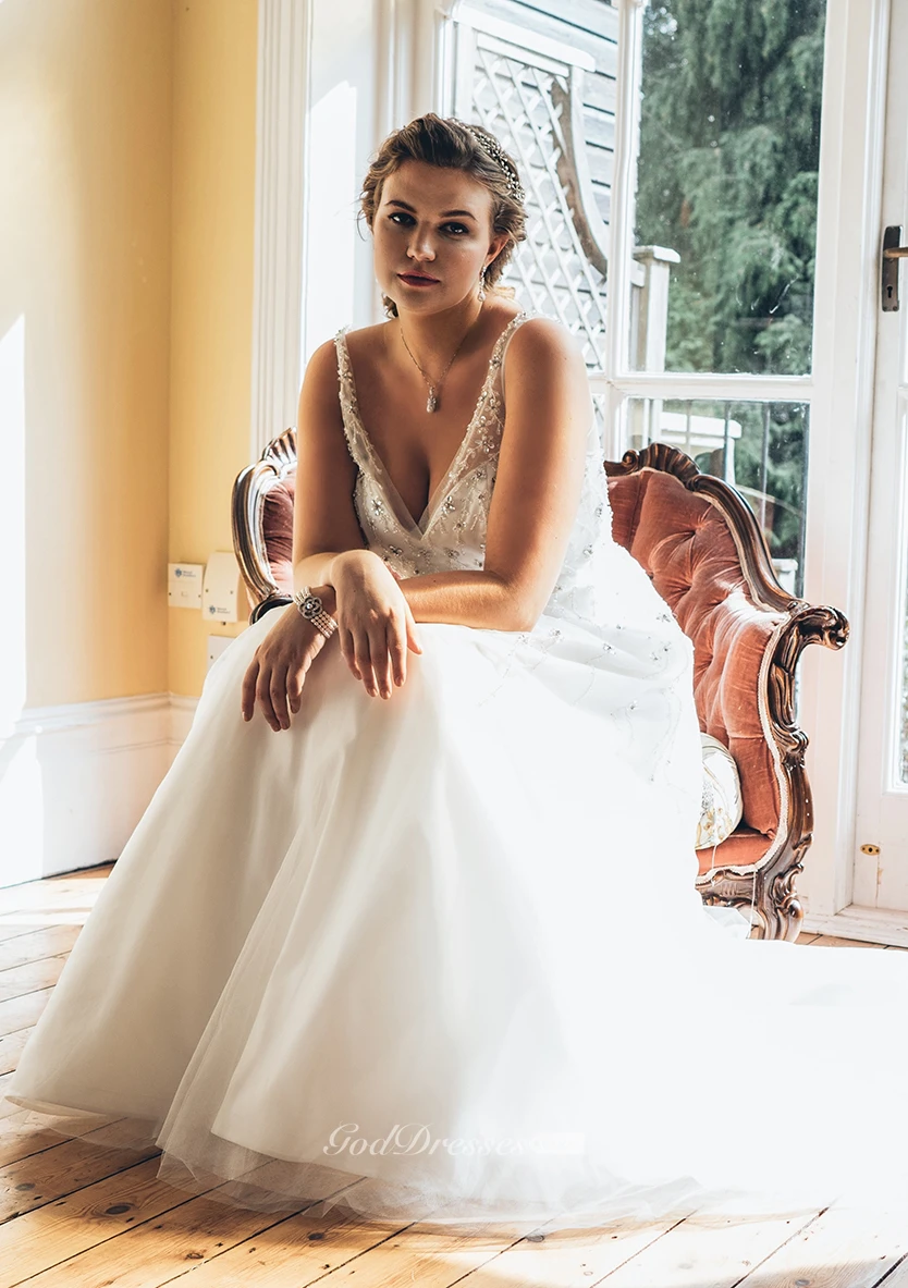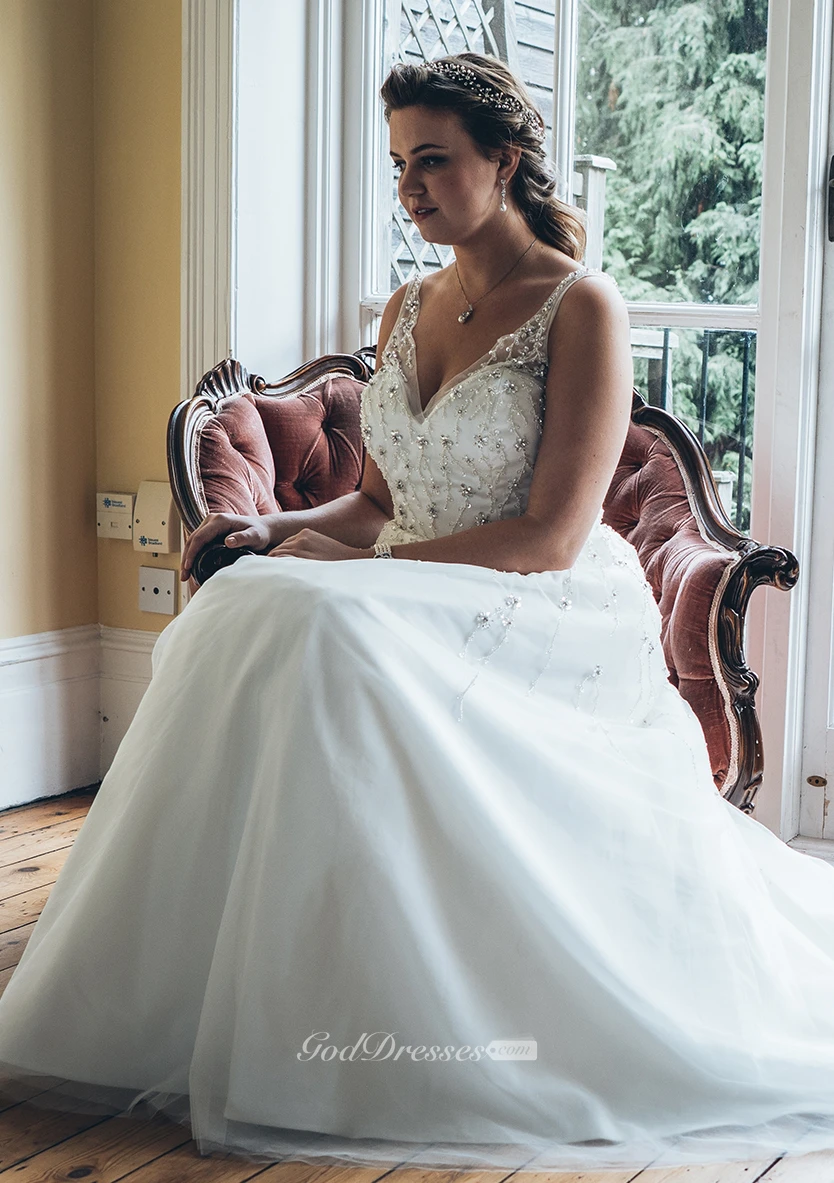 A-Line Floor-Length V-Neck Sleeveless Tulle Sweep Train Crystal Detailing Dress