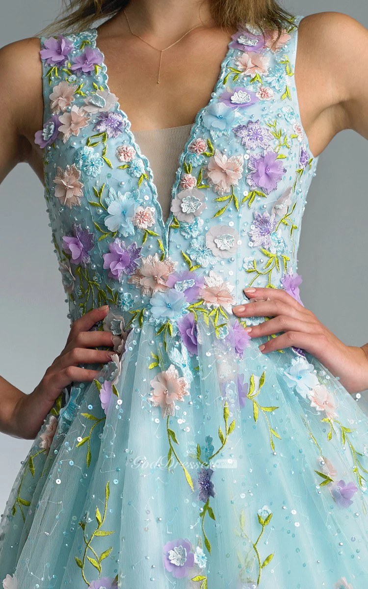 A-line Floor-length V-neck Sleeveless Tulle Zipper Dress