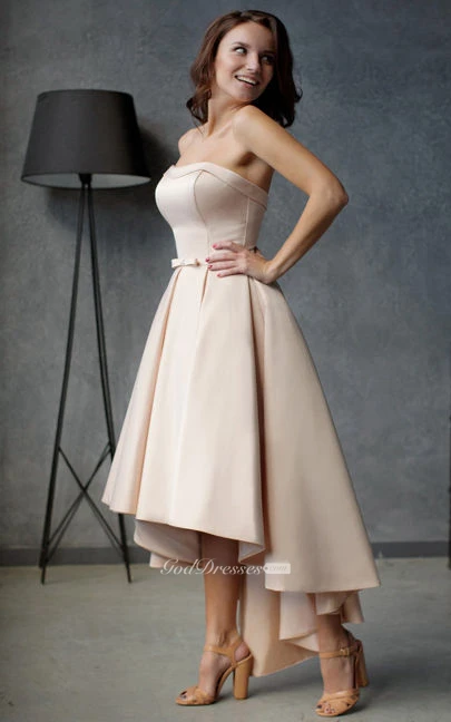 A-Line High-Low Strapless Sleeveless Satin Pleats Ruffles Zipper Dress