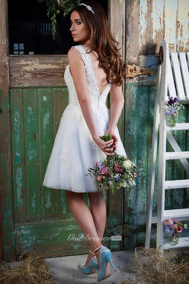 A-Line Jeweled Short Sleeveless Square-Neck Lace Wedding Dress With Appliques And V Back