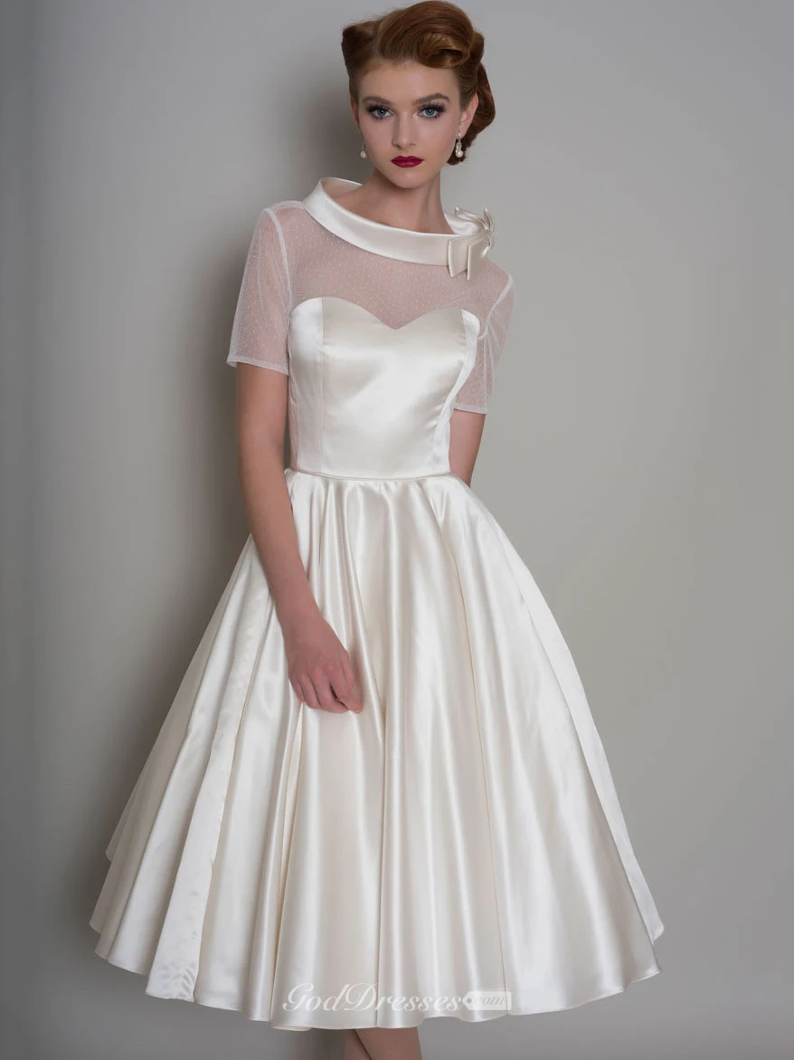 A-Line Knee-Length Bowed Short-Sleeve Satin Wedding Dress