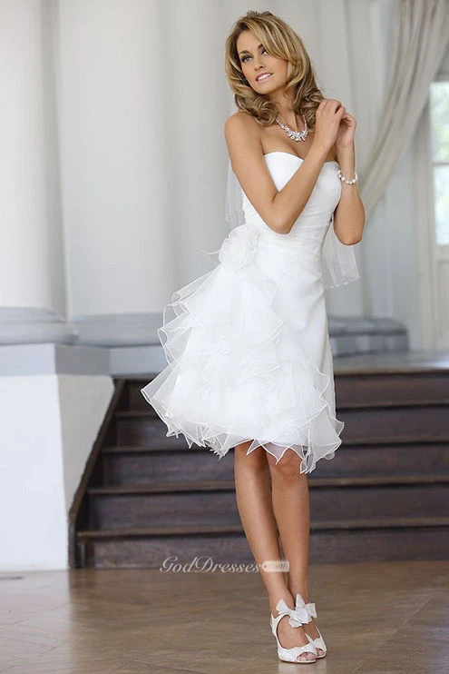 A-Line Knee-Length Ruffled Strapless Tulle Wedding Dress With Flower And Draping